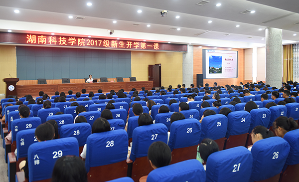 “大学是什么?为什么要上大学?”陈弘随即向新生抛出问题,引发大家深思。陈弘说,这是你们和我们将要用四年的时间在一起来求解的问题。他深情地回顾了学校的办学历史、文化地理环境,向大家解读和展望学校的文化内涵和精神气质。“一所好的大学,一要时间沉淀,二要空间滋养。”陈弘由远及近,从湖南到永州再到西山、柳子庙、朝阳岩、潇水介绍了学校与众不同的文化地理环境。他说,学校在永州神奇山水和厚重历史文化的双重浸润中,散发出一种独特的气质和厚重的文化气息,淡定从容,优雅精致,内涵丰富,是一块读书成才的风水宝地。