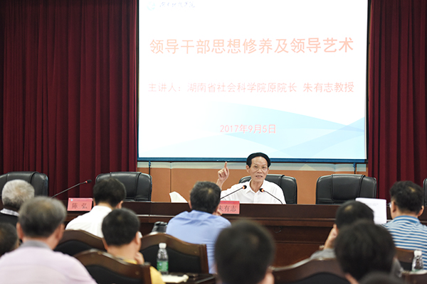 湖南省社会科学院原院长、博士生导师、国家社会科学基金项目评审会专家、享受国务院政府特殊津贴专家、长沙县开慧村党支部第一书记朱有志紧紧围绕中层干部应当具备的素质与能力这一主题展开,他提出六个重要观点:一是本科大学的中层干部应具有教育家、政治家的情怀与素养;二是要按照习近平总书记提出的好干部的五项重要标准来严格要求自己;三是要灵活运用辩证法来开展工作;四是高校中层干部应当具有“忠、勇、智、仁、公”的修养模式;五是要懂“四会”,即会育人、会带人、会管人和会帮人;六是要提高“四力”即执行力、团结力、承受力和影响力。他希望全体干部把提高思想修养和工作艺术作为终身必修课,助力学校各项事业取得更好地发展。