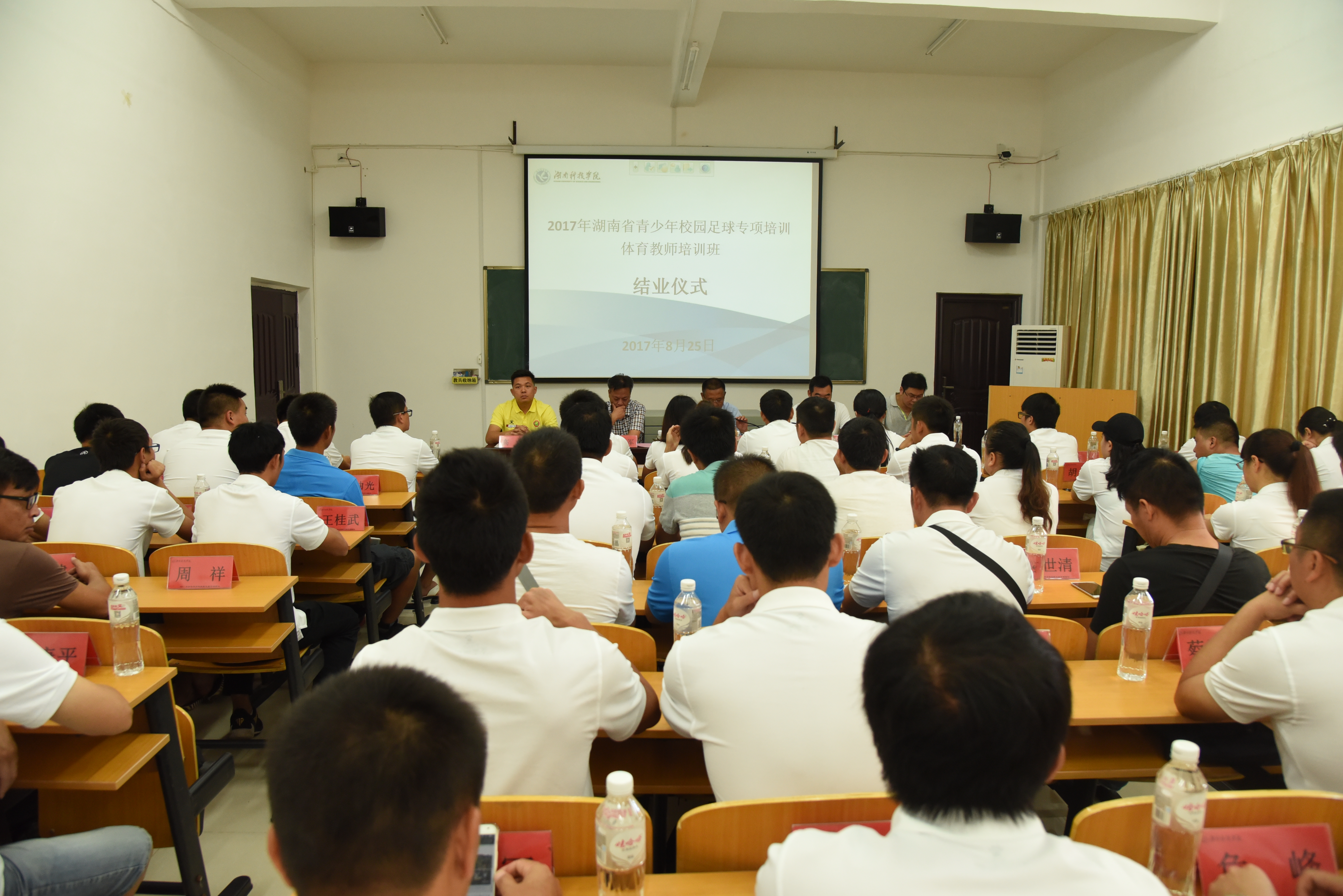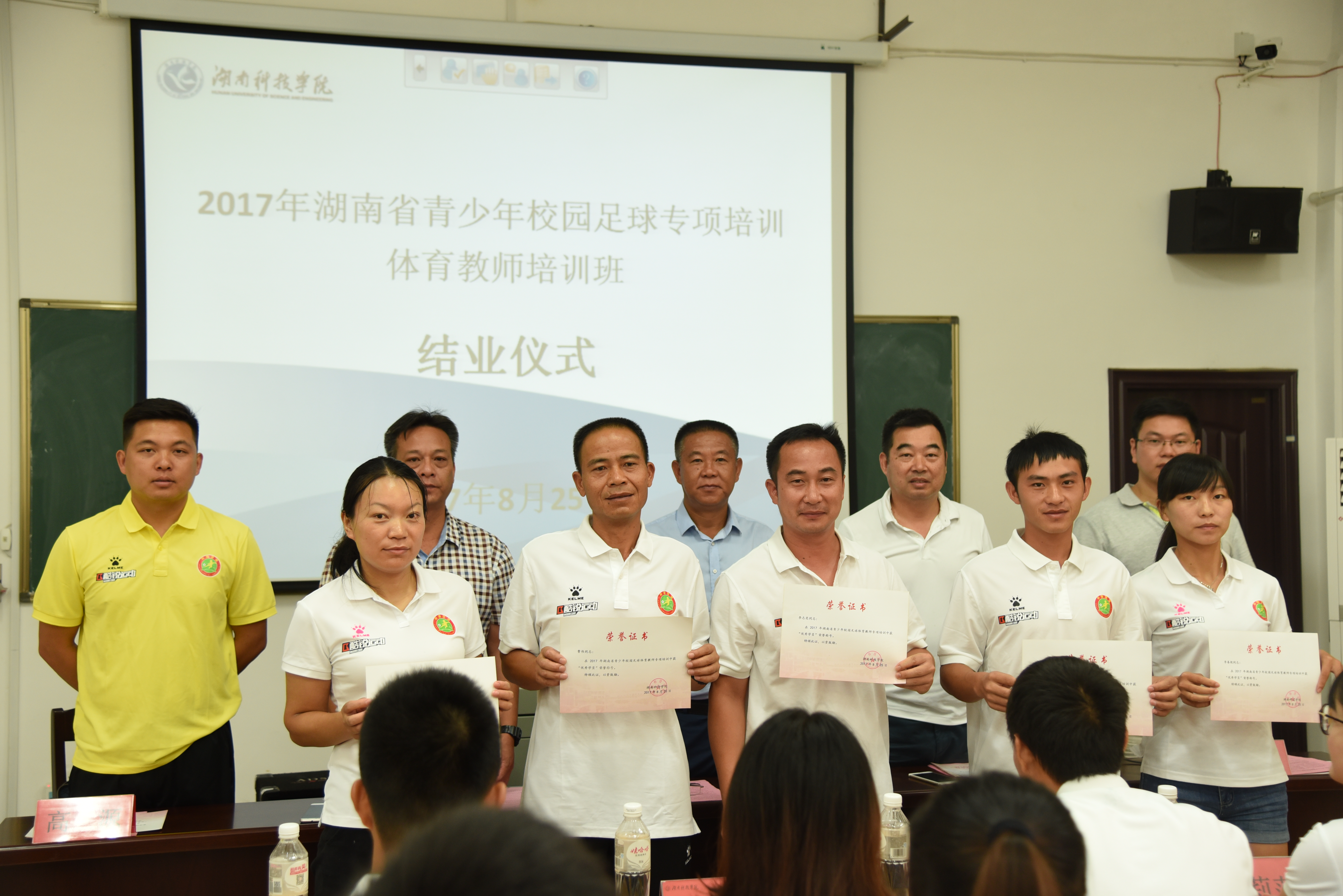 本网讯 8月25日上午,为期12天的2017年湖南省青少年校园足球专项培训体育教师培训班在我校圆满结束。体育学院领导班子成员出席结业仪式,并为优秀学员颂发荣誉证书。