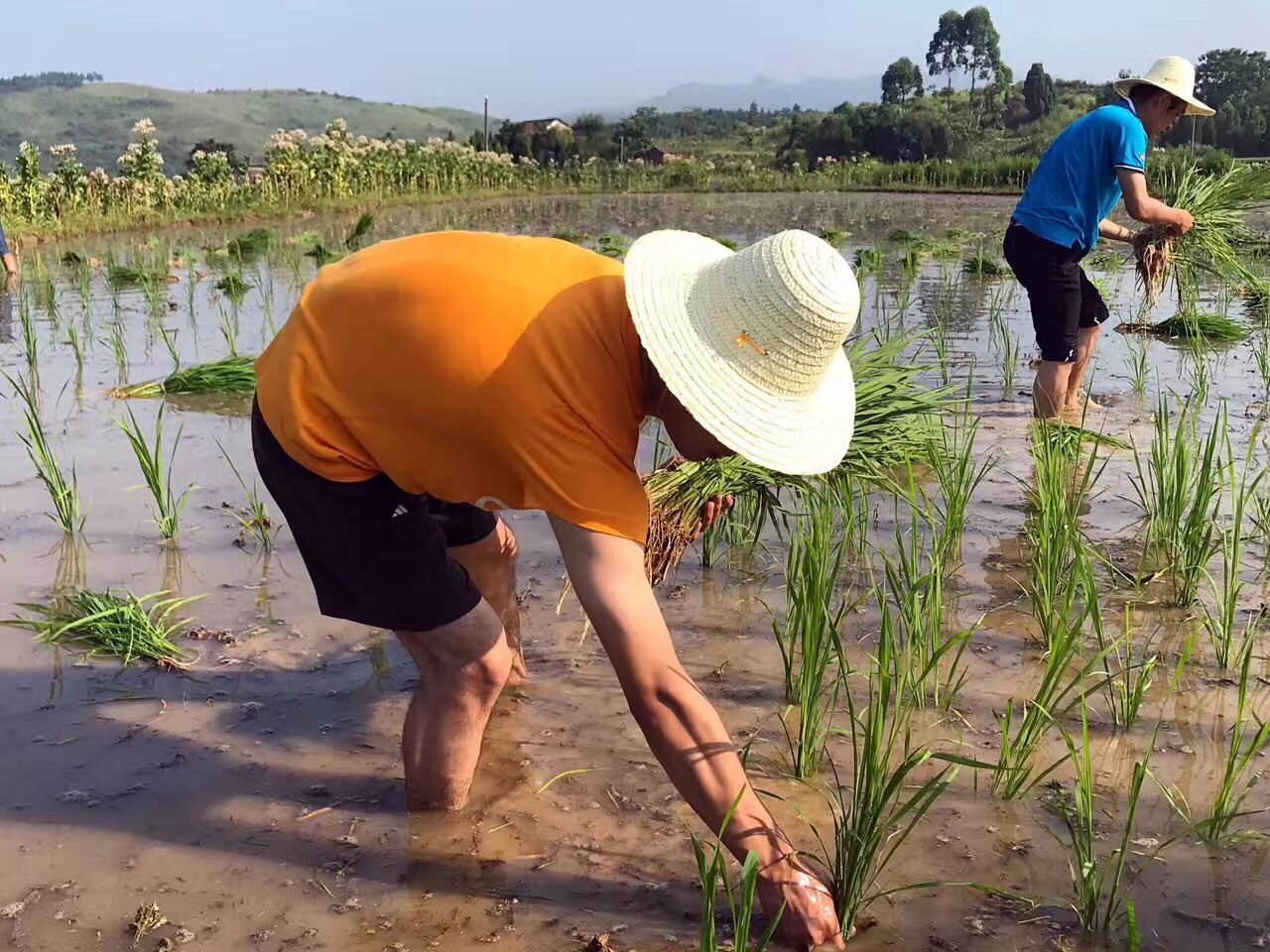眼下正值烟田翻耕移栽晚稻秧苗时节,新夏荣村的烟农都忙着插秧。贫困户陈远贞的父母丧失了劳动能力,家里劳动力缺乏,九游在线实践帮扶小组在了解到情况后马上赶来帮忙。他们卷起裤腿踏入田地,拿起秧苗和陈远贞一起认真的插了起来。虽然天气炎热,大家忙得满头大汗,但是并没有任何松懈,经过一天的辛苦劳作,陈远贞家里的三亩田全部插完。