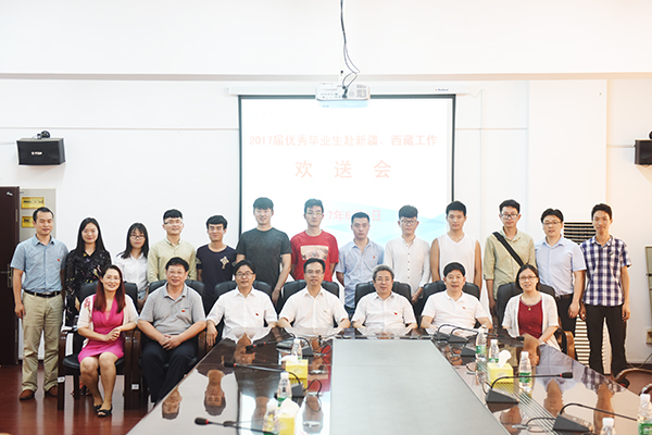 本网讯 6月9日上午,学校在行政办公楼六楼会议室召开2017届优秀毕业生赴新疆、西藏工作欢送会。校党委书记陈弘、校长曾宝成、纪委书记彭立威与即将奔赴新疆、西藏工作的十余位2017届优秀毕业生交流畅谈,送上了诚挚的祝福和嘱托。