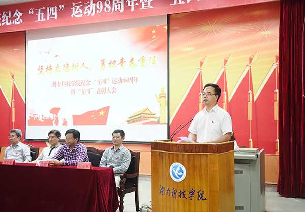 陈弘代表学校党委、行政向广大青年学子致以节日的问候,向受到表彰的先进个人和集体表示热烈的祝贺。他指出,98年前,广大的青年学生发动的轰轰烈烈的五四运动,开启了中国革命的新纪元。98年来,青年学生在救亡图存、振兴中华的历史上谱写了一曲曲感天动地的青春乐章。他强调,作为大学生,就是要敢于有梦、勇于追梦、勤于圆梦,在实现祖国复兴大业的伟大进程中实现青春梦想,努力成为可堪大用、能担重任的栋梁之材,努力做到明德至善、德才兼备;博学笃行、勇于创新;自强不息、艰苦奋斗。他希望青年学子牢记习近平总书记对我们的殷殷嘱托,以国家富强、人民幸福为己任,在学校追求“双一流”目标中志存高远,为建设富饶美丽幸福新湖南贡献青春力量。