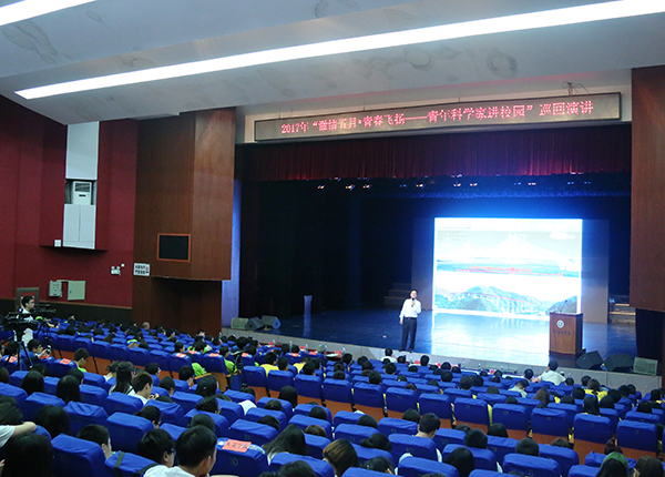 本网讯 5月12日上午,“激情五月·青春飞扬——青年科学家进校园”巡回演讲活动走进我校。湖南省科协党组成员、副主席刘晓河,湖南省科协正处级干部周厚明,校长曾宝成、副校长李常健等出席,活动由永州市科协党组书记、主席翟方奇主持。