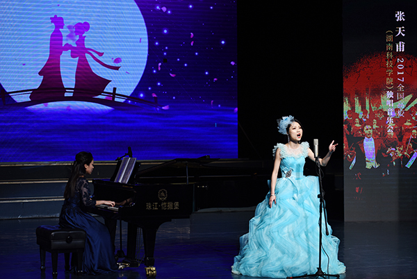 《绒花》《在水一方》《茉莉花》,带有浓郁中国风的歌曲让观众大呼过瘾;《圣母颂》《请别忘记我》《热恋中的士兵》《女人善变》《军中女郎》等几首外国经典艺术歌曲、难度非常大的歌剧咏叹调让观众如沐春风,高音C是所有男高音都畏惧的顶峰,然而今夜张天甫完美的唱出了高质量的十个高音C,令所有观众惊叹;《爱在中国》《格拉纳达》《饮酒歌》,压轴歌曲叫人心潮澎湃,无比动容。音乐会上,20首经典之作轮番上演,好戏连连。莫大尼、龙湘菡、陈婉云等我校优秀声乐教师组成的嘉宾团队倾情助阵,更是为音乐会锦上添花。