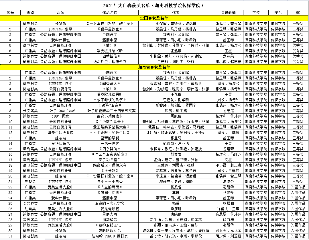 由传媒学院张鸽萍、曾玉琴老师指导,李渲渲、曾德葆、谭彦琳同学的作品《一份蛋糕引发的“酸”案》获得国家级一等奖。曾玉琴,张鸽萍老师指导的学生戴雯佳、马丹妮、杨林垚同学的作品《俊平急救室》获国家级二等奖,曾玉琴老师指导的学生邹秀利、余朝晖同学的作品《中国速度》、李潇艺、田小明、叶希雅同学的作品《逐鹿中原》分别获得国家级三等奖。同时,该院在2021年湖南省大学生广告艺术大赛中荣获省级等级奖21项,入围奖及优秀奖10项。