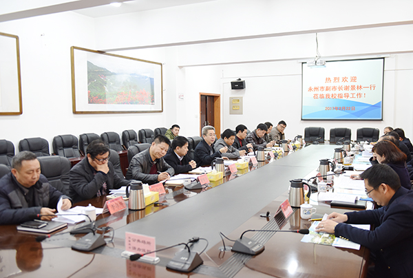 本网讯 2月22日下午,永州市人民政府副市长谢景林一行莅临我校调研指导,参观了校园并听取了校长曾宝成的有关介绍。