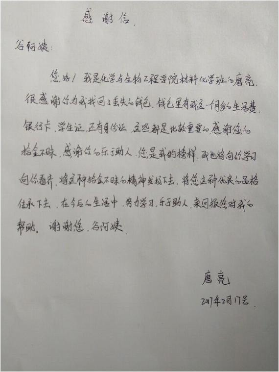 谷祝英是我校一名普通的宿舍管理员,唐亮在写给谷阿姨的感谢信中写道:“感谢您的拾金不昧,感谢您的乐于助人,您是我的榜样,我也将向您学习,向您看齐,将这种拾金不昧的精神发扬下去,将您这种优良的品格传承下去”。