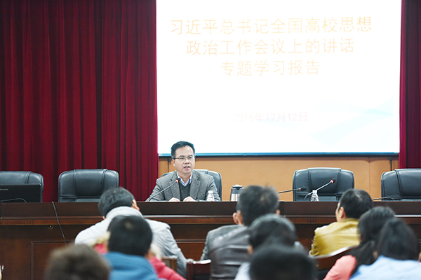 本网讯 12月12日下午,学校举行学习习近平总书记在全国高校思想政治工作会议上的重要讲话精神专题学习报告会。校党委书记陈弘为我校思想政治工作队伍和学生代表作专题报告。