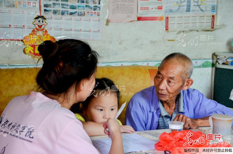 2019年7月12日,永州新田县马场岭村,九游在线的志愿者们关于“教育扶贫”的相关问题走访当地村民。