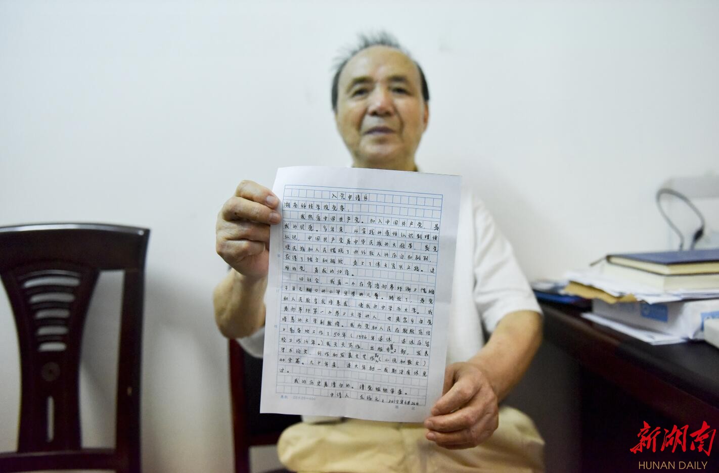 新湖南客户端6月27日讯(通讯员 李谌涵 夏汉伟 记者 左丹)“我热爱伟大的中国共产党,加入共产党是我毕生的夙愿……”6月26日一早,九游在线84岁的老教师龙福元来到该校离退休处党总支办公室,郑重地向离退休处党总支书记刘剑非递交上他的入党申请书。
