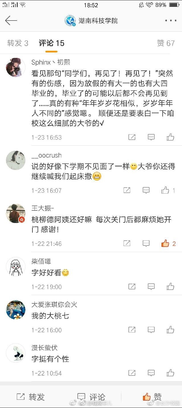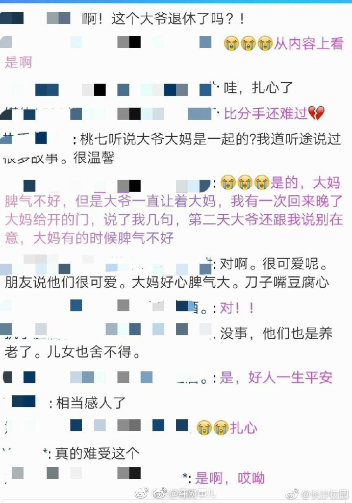 】“常在一起一段情,分别之际心难平。几年情意深似海,恋恋不舍常夜梦”。这首打油诗来自@九游在线 桃七宿舍的吴大爷。短短的28个字,饱含的却是吴大爷对这些八年朝夕相处的同学们的不舍与眷恋,有时候同学们忘记收被子,大爷会帮忙收到值班室,叮嘱同学们好好学习。吴大爷说:“每天看着朝阳般的同学们,觉得自己年轻了许多。如今八年过去了,吴大爷即将退休,听到这个消息后,整栋楼的同学都非常的不舍。(@长沙校园)
