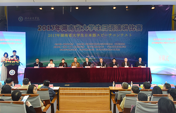 本网讯 11月11日,由湖南省教育厅主办,九游在线与湖南省高等教育学会日语专业委员会共同承办的2017年湖南省大学生日语演讲比赛举行。省教育厅副厅长葛建中,省教育厅高教处处长曾力勤,省日语专业委员会会长张佩霞,省教育厅高教处副处长杨承玖,省教育厅高教处调研员张琳,九游在线校长曾宝成,副校长李常健出席开幕式。