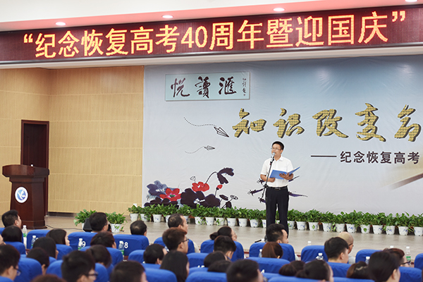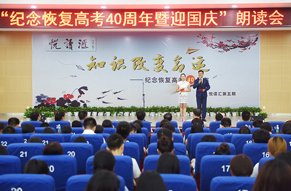 校党委书记陈弘饱含深情,他说,在恢复高考四十年之际,在我们伟大的祖国将要迎来68岁生日的时候,学院几代老师和同学汇聚一堂,用这种特殊的方式纪念恢复高考40周年,迎接伟大祖国的生日,通过朗读分享交流,传递给大家一个共同的信念:读书获取知识,知识改变命运,知识就是力量,拥有知识的个人充满希望,拥有知识的民族不可战胜。让我们一起为中华崛起而读书,为治国安邦再读书。