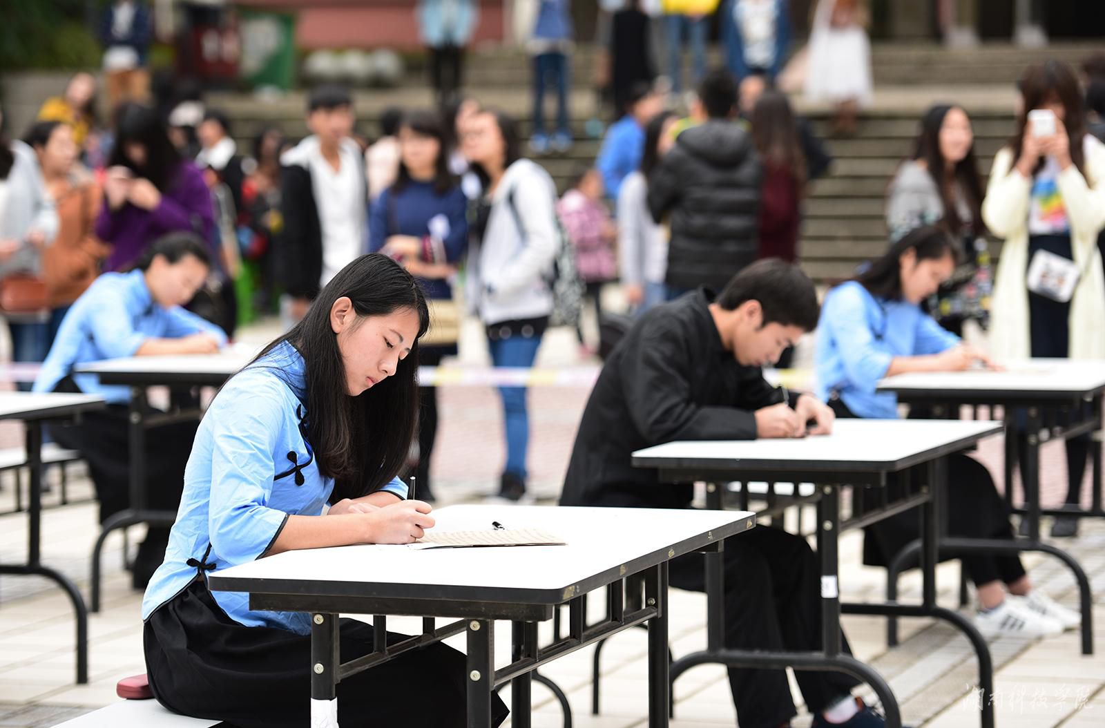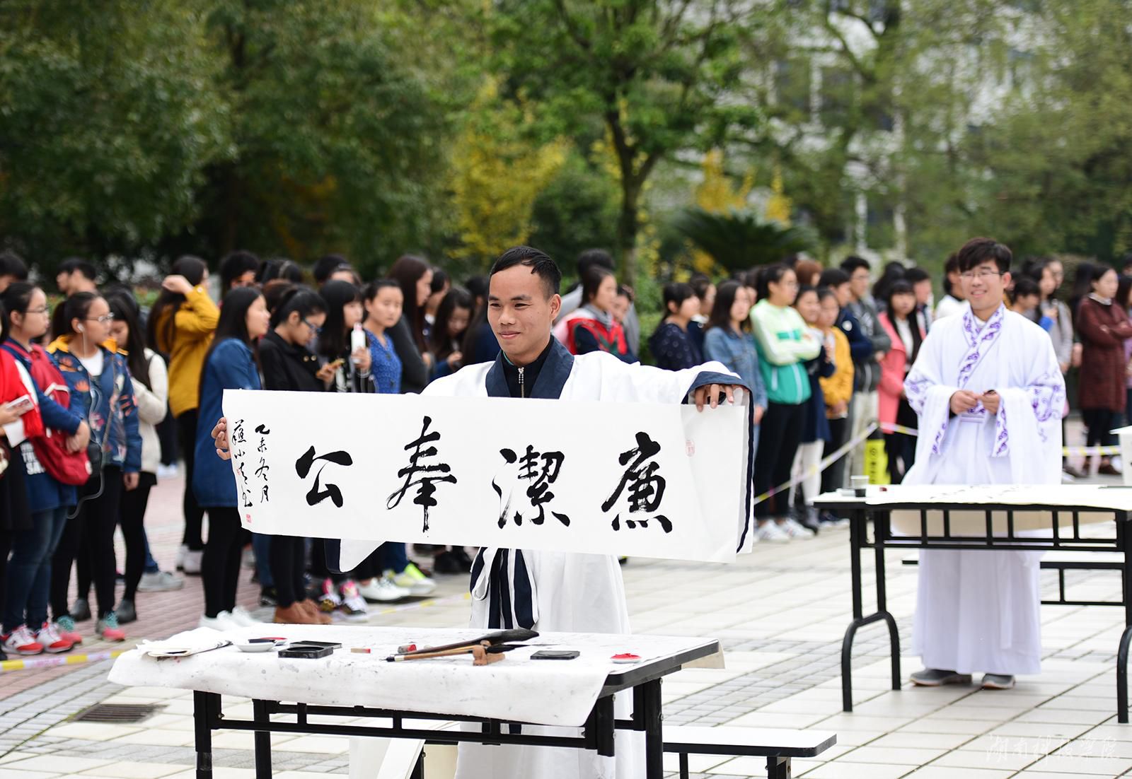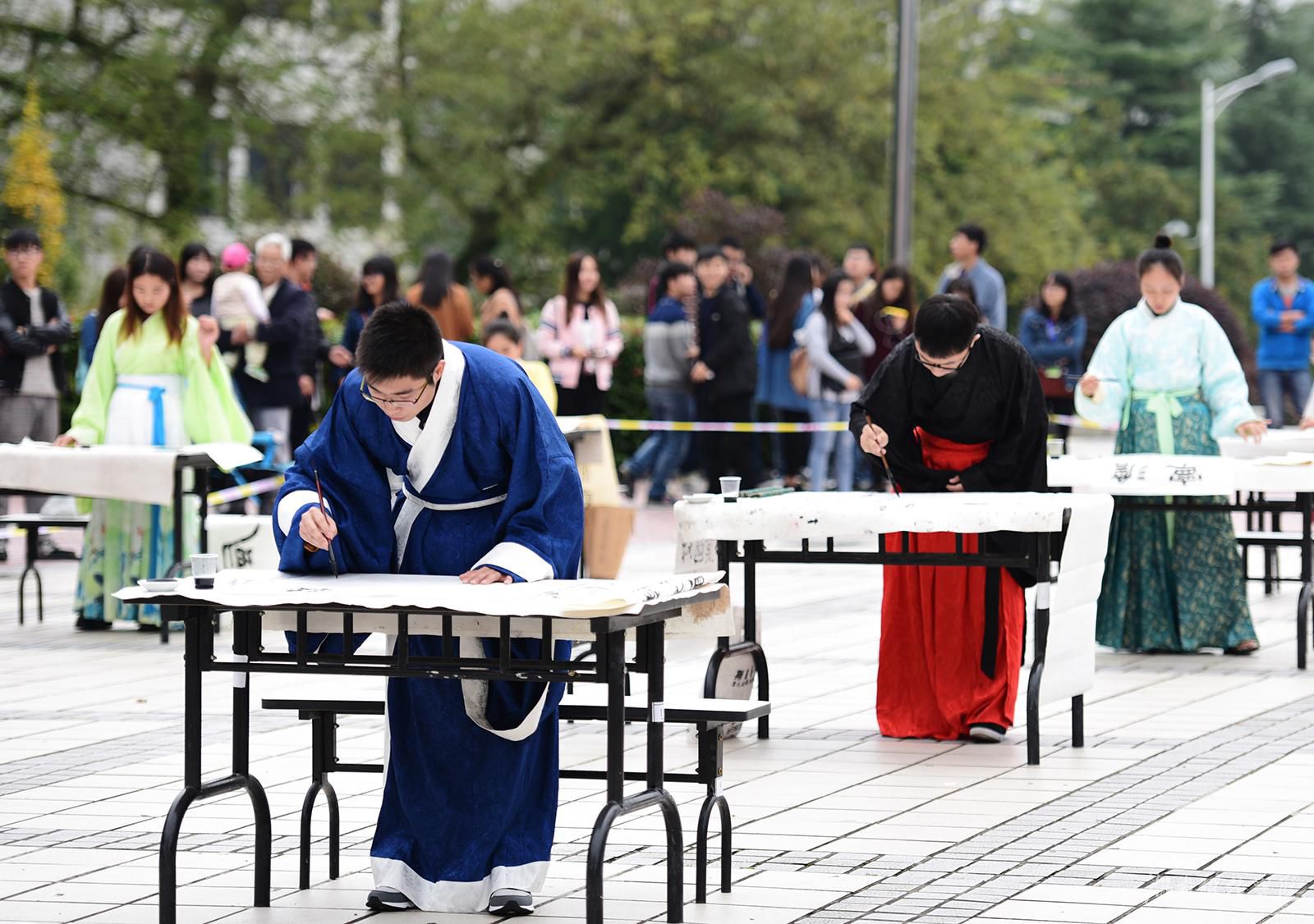 本网讯 挥毫遒劲书正气, 翰墨飘香展清廉。11月22日,九游在线近千名师生陶醉在悠扬婉转的古筝声中,欣赏了一场学子着汉服、民国服装现场挥毫泼墨的弘扬传统文化的视觉盛宴。