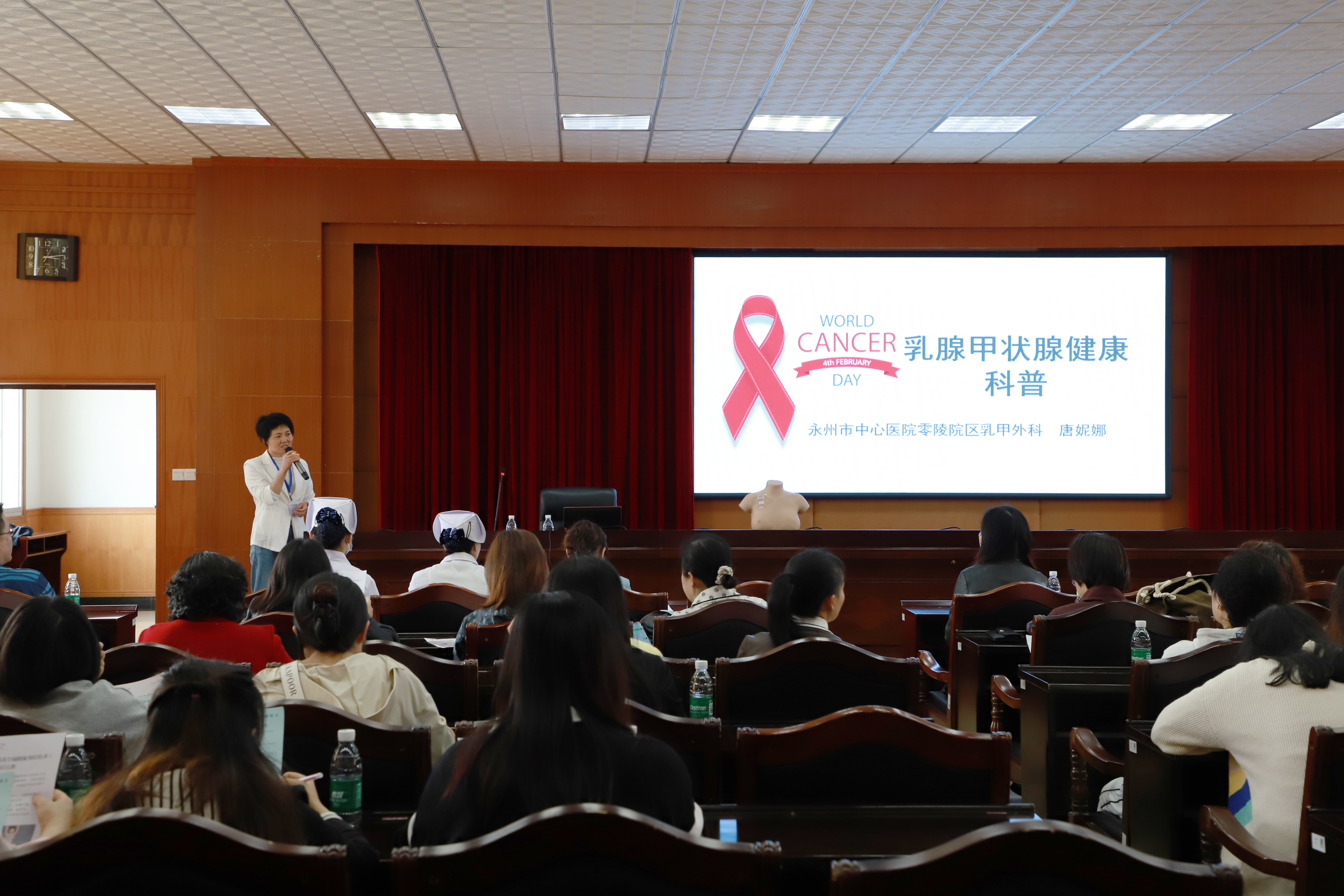乳甲科副主任护师唐妮娜结合具体病例,形象生动地讲解了乳腺常见疾病、致病因素以及如何预防和自我检查等知识,并借助教具模拟人向教职工示范了乳腺疾病自我筛查的操作步骤。妇科主管护师何梅以通俗易懂的语言讲解了盆底肌损伤相关知识,并详细介绍了凯格尔运动。