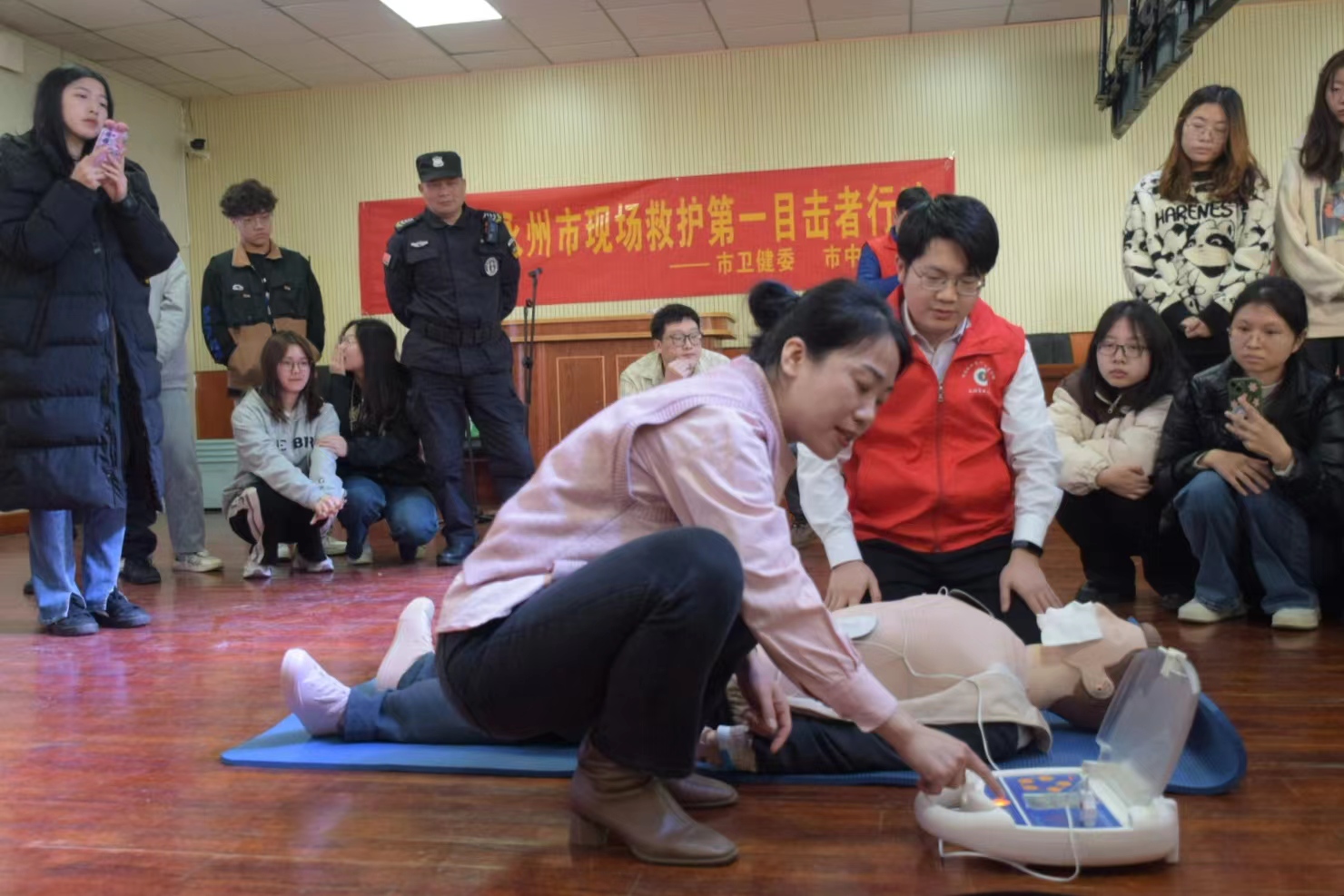 培训现场,永州市中心医院护理部副主任林海菊主任护师以具体事例阐明了“第一目击者”急救的重要性,为同学们解读了湖南省现场救护条例和第一目击者的“三个一”理念。麻醉科、急诊科、骨科的医护人员向大家讲解了AED的使用,通过现场示范向大家展现了心肺复苏的操作流程,详细地讲解了创伤急救和气道异物梗阻急救知识,详细介绍了演示了海姆立克急救法。全体培训导师对同学们进行急救操作技能培训,让参训人员系统全面地学习救护知识和急救技能。