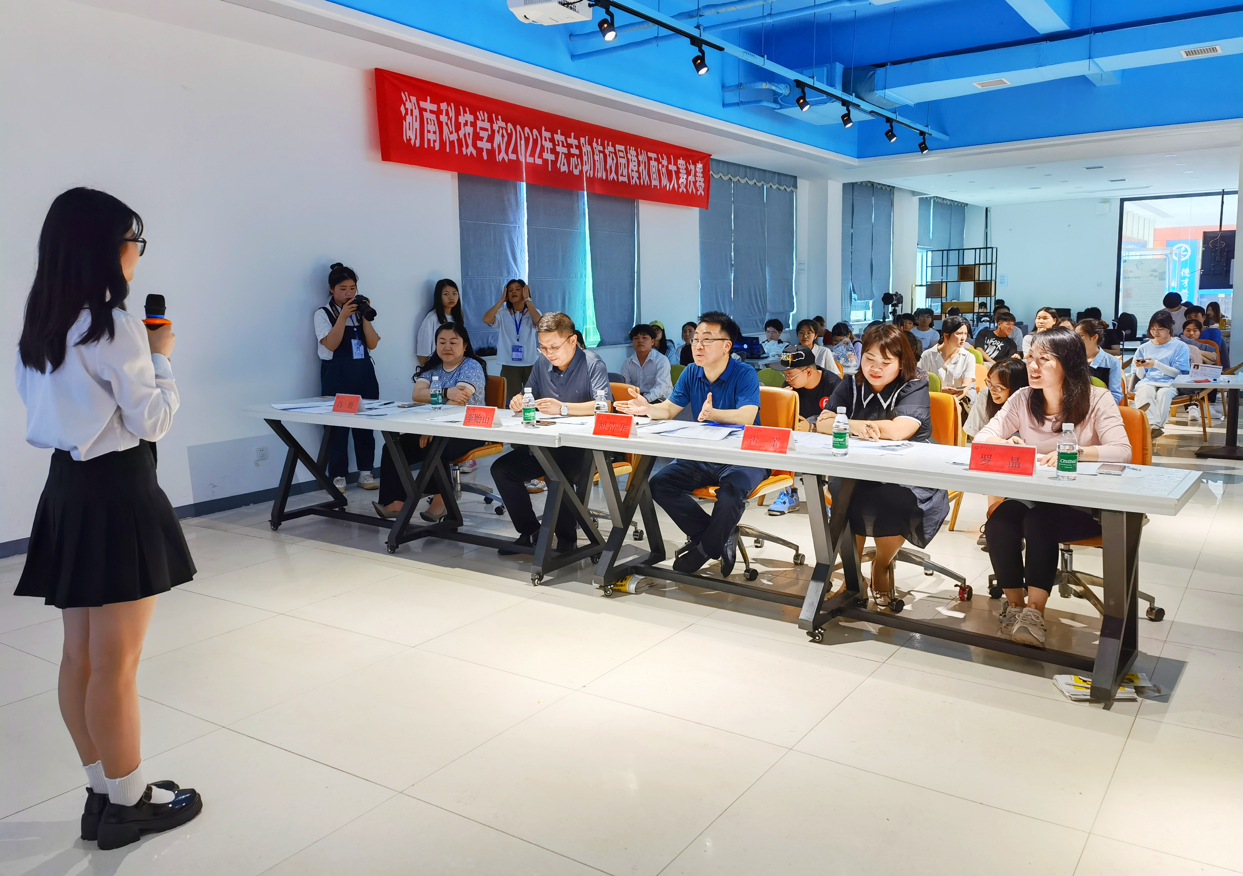 此次比赛旨在为毕业生解决求职面试过程中实际困难,扩展融入“宏志助航计划”就业能力提升培训实践教学环节,进一步提升2022、2023届毕业生的求职面试技能。比赛经过了简历初筛、无领导小组讨论复赛,共有12位选手脱颖而出晋级总决赛。招生就业处处长胡清华、招生就业处副处长冯煜、外国语学院党总支副书记罗晶、中国人寿保险股份有限公司永州分公司人力主管李贻山、中公教育集团永州分校校长雷蕾共同担任决赛评委。本次决赛共分为自我介绍、情景回答和自由问答三个环节,选手们围绕求职意向,从个人信息、获奖情况、实习实践经历等方面,通过PPT、VCR、作品等方式进行自我展示。面试官着重从岗位认知、自身优势、岗位匹配度等方面进行面试提问。面对评委犀利的提问,选手们沉着思考,机智地应对,充分呈现了选手们的个性特点、行为风格以及组织协调、口头表达、逻辑思辨等方面的能力。