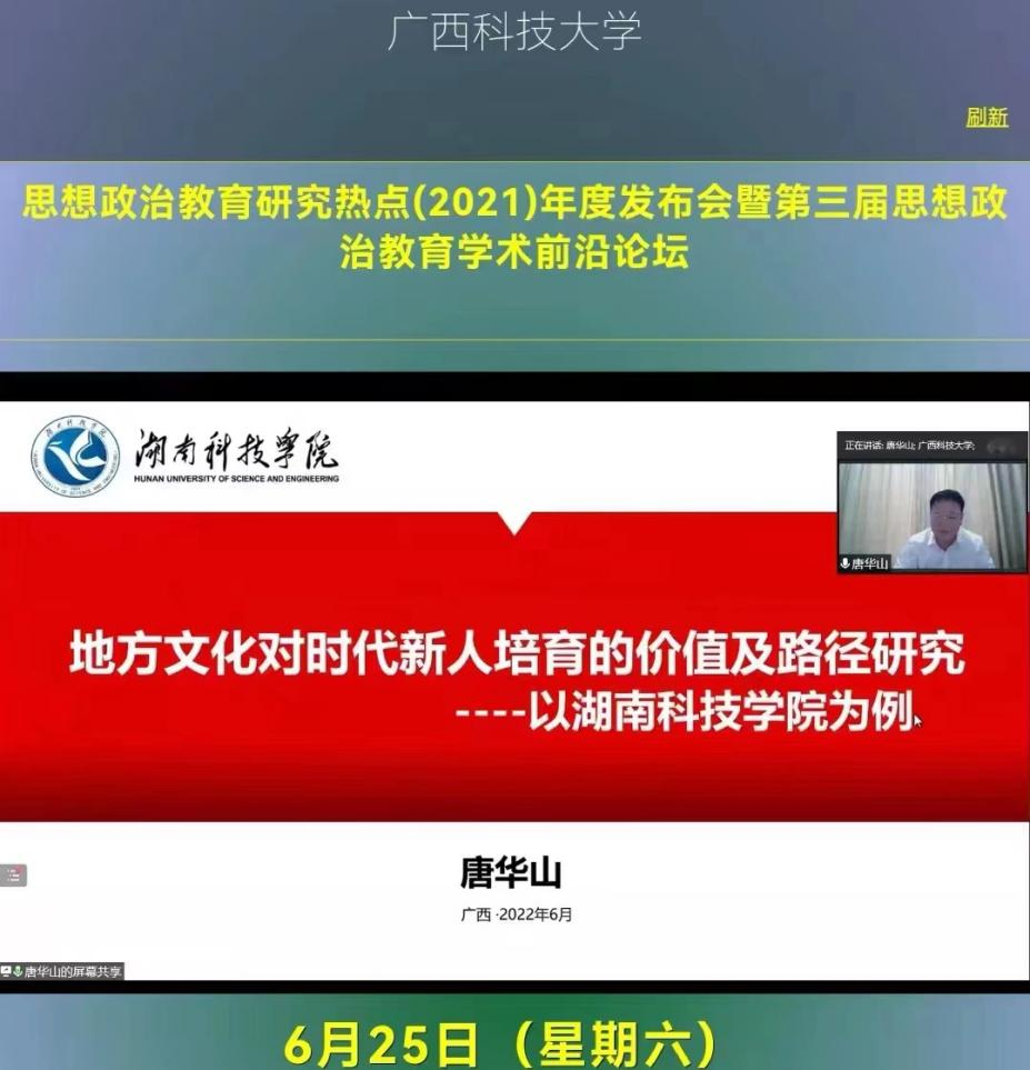 本网讯 6月25日下午,思想政治教育研究热点(2021)年度发布会暨第三届思想政治教育前沿论坛在广西科技大学召开,学生工作部部长唐华山应邀出席会议并线上作了题为《地方文化对时代新人培育的价值及路径研究——以九游在线为例》的主旨报告。