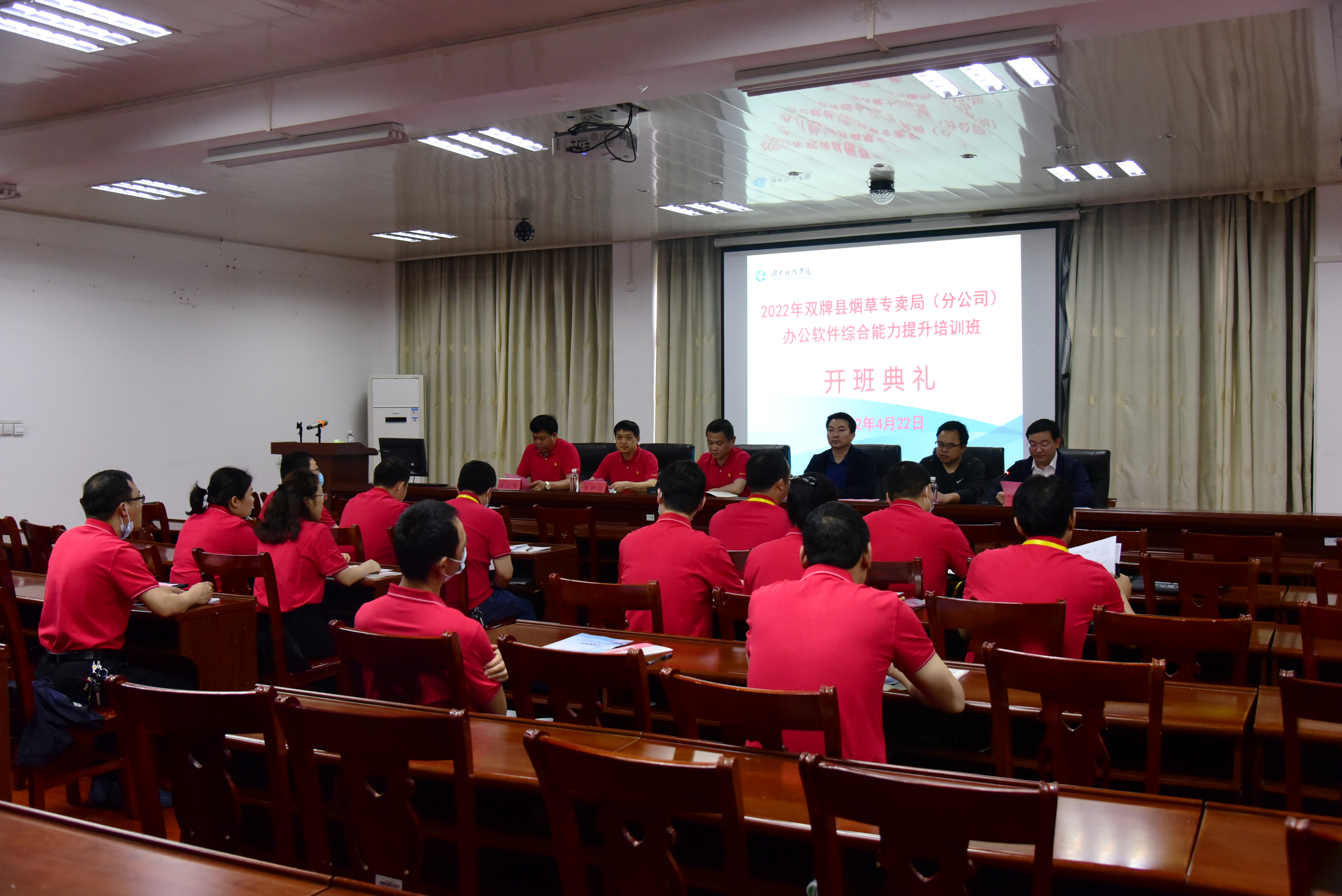本网讯 4月23日,2022年双牌县烟草专卖局(分公司)办公软件综合能力提升培训班在我校成功举办,双牌县烟草专卖局(分总司)全体工作人员参加本次培训。双牌县烟草专卖局(分公司)党组书记、局长彭军,继续教育学院班子成员及信息工程学院副院长张彬出席开班典礼。