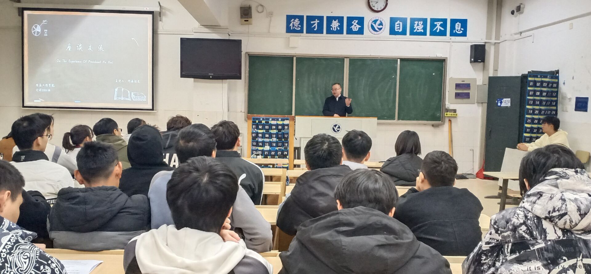 本网讯 12月1日晚,校党委委员、副校长何海到信息工程学院计科2001班,参加“创建卫生安全宿舍,共造文明健康环境”主题班会,指导班级开展安全教育,并与同学们进行深度沟通交流。