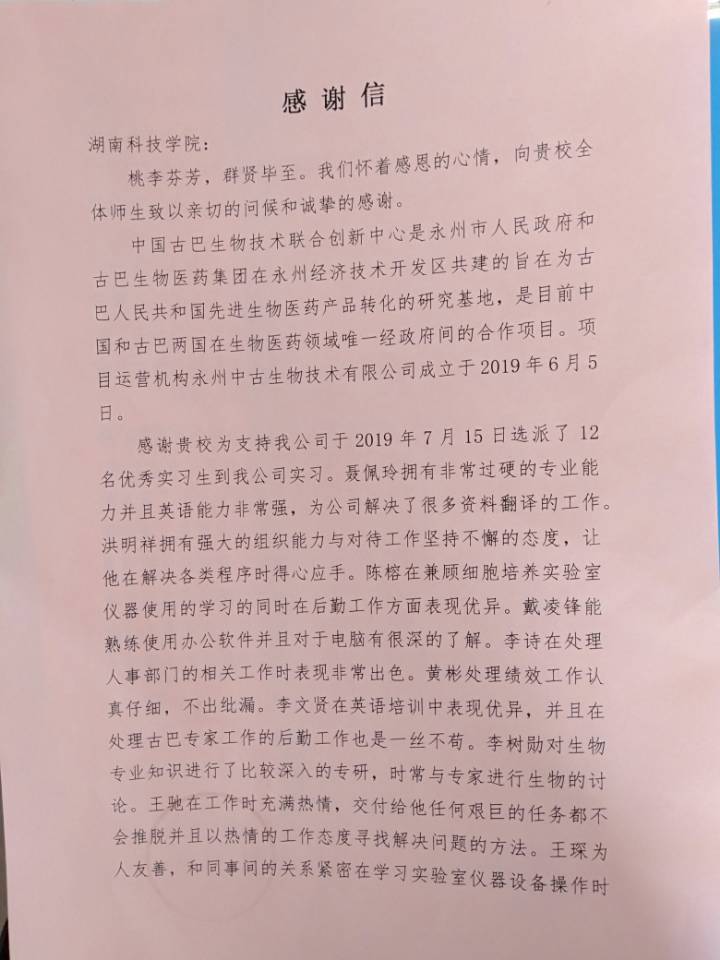 本网讯 7月22日,化学与生物工程学院收到一封来自永州中古生物技术有限公司的感谢信,点赞学院毕业生。