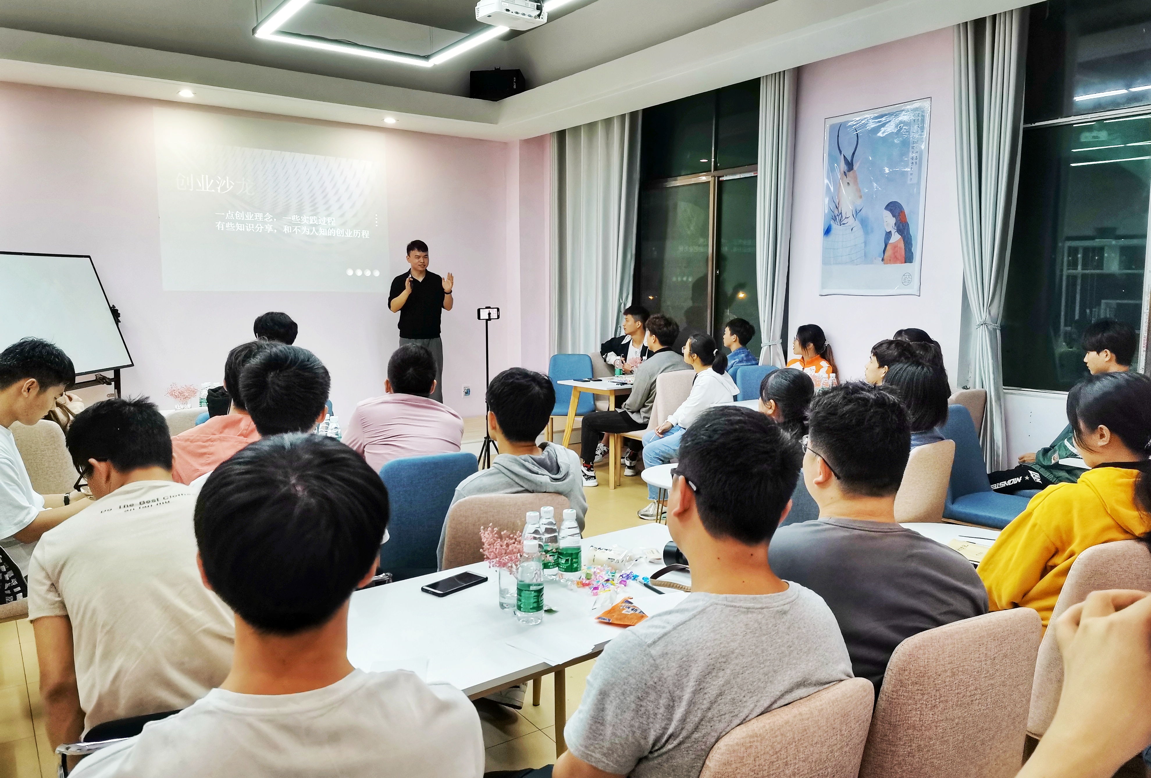 本次沙龙以“讲点干货,交个朋友”为主题,汤凯杰从为什么创业、怎样低风险创业和如何处理创业问题三个方面分享了自己大学期间的创业经历和创业理念。作为大学生创业者,他说,要摆脱学生思维,用创业者思维对待大学生活的方方面面,有想法时要敢于实践,不要给自己的人生设限。现场气氛轻松,同学们踊跃发言探讨自己大学的经验和疑问。