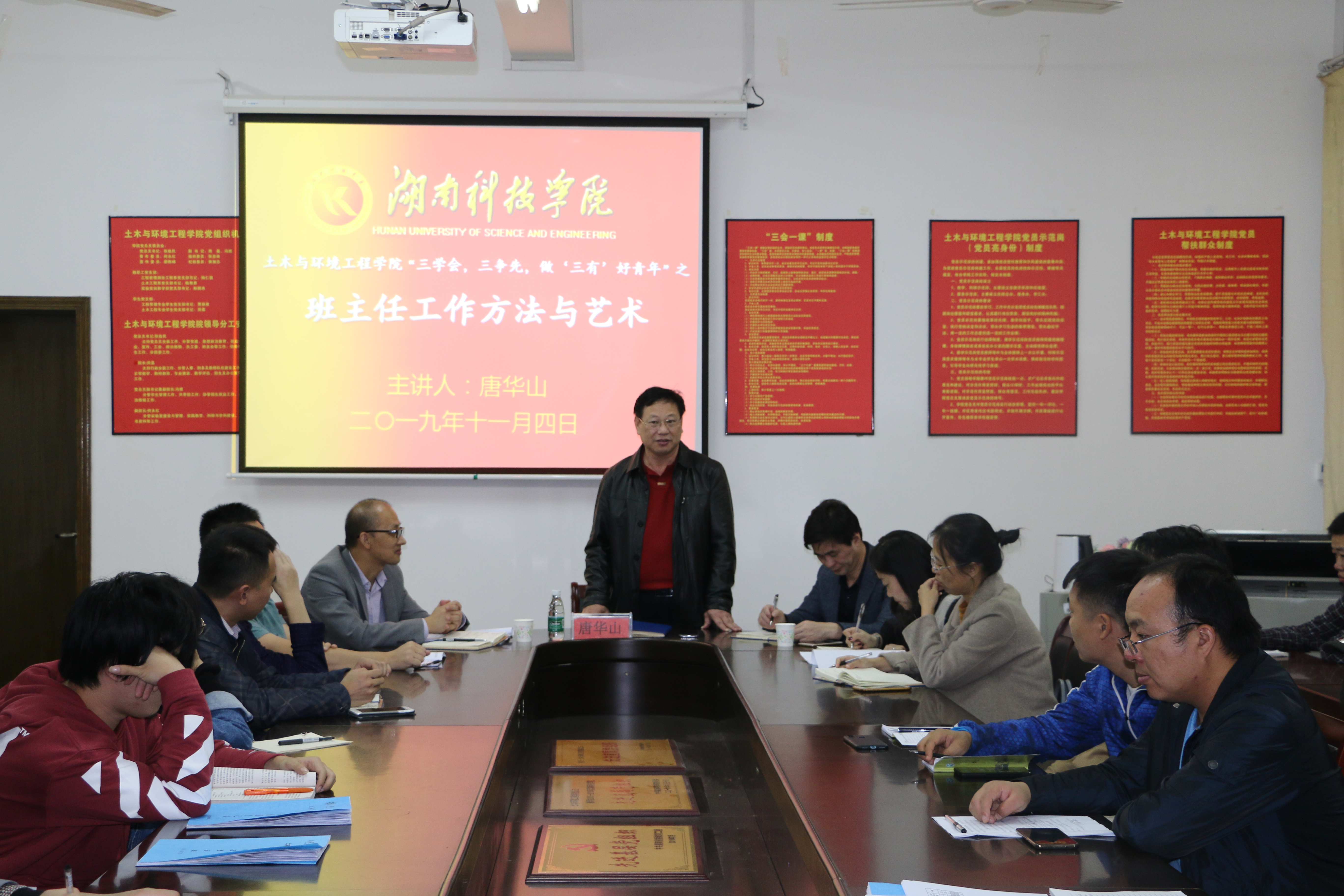 本网讯 11月4日晚上,学工部长唐华山为土木与环境工程学院教师做了题为“班主任工作方法与艺术”的讲座,该院党总支书记张俭民主持讲座,该院全体辅导员、班主任参加。
