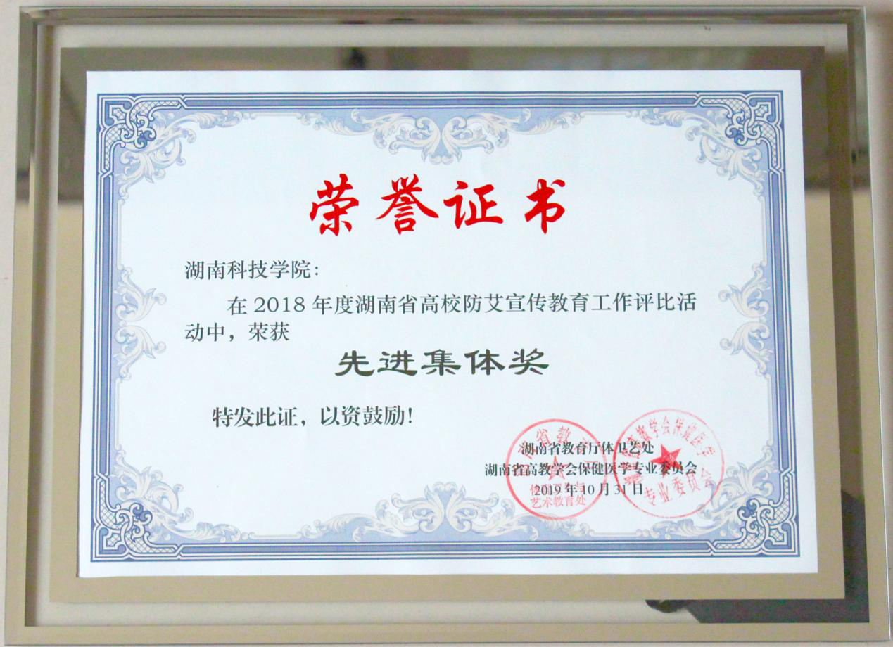 本网讯 10月31日,由湖南省高校保健医学专业委员会主办的湖南省高校保健医学会2019年年会在长沙卫生职业学院召开,会上颁发了2018年度湖南省高校防艾宣传教育工作评比活动有关奖项,我校荣获“先进集体奖”。