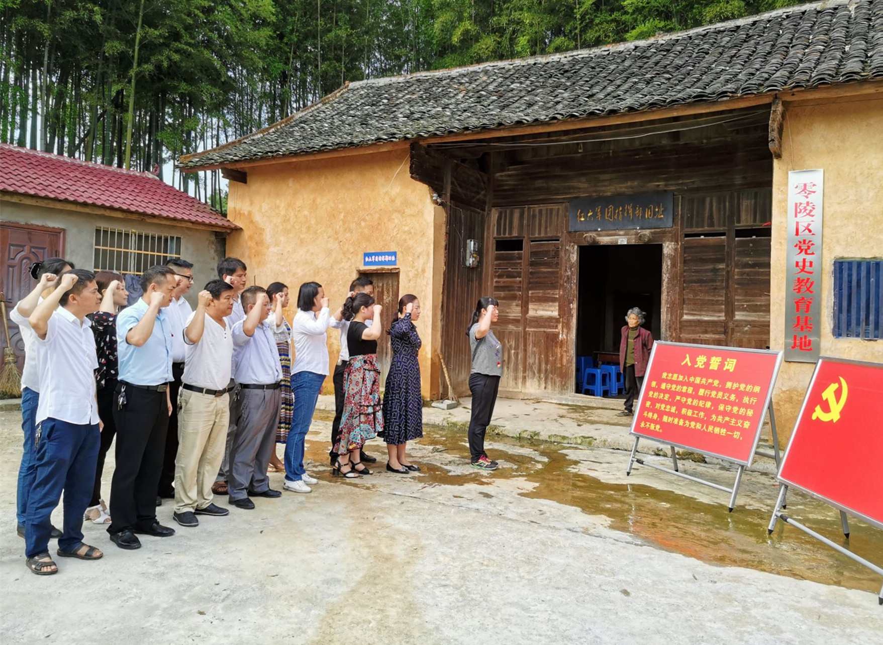 在红六军团指挥部旧址,全体党员重温了入党誓词,参观了指挥部旧址,聆听了当年红六军团长征经过零陵时不进村扰民,不拿群众一针一线,天当被、地当床的感人故事。