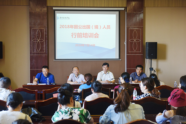 本网讯 7月14日上午,我校2018年暑假因公出国(境)人员行前培训会在行政楼八楼三会议室举行。永州市旅游外事侨务局副局长刘璇以及永州市公安部门相关负责人应邀为师生作了专题培训,副校长宋宏福出席,国际交流与合作处处长郑际根主持培训会。