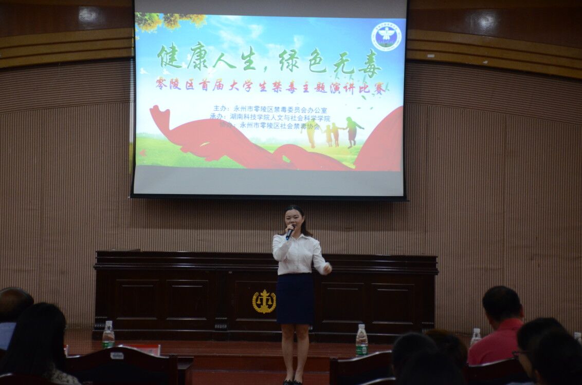 本网讯 为切实增强全民识毒、防毒、拒毒的意识和能力, 5月23日晚,人文学院联合零陵区禁毒办在明德楼二楼报告厅举行“健康人生,绿色无毒”零陵区首届大学生禁毒主题演讲比赛。零陵区禁毒办主任夏杰、区团委书记毛岭峰、区社会禁毒协会会长李谋德等出席。