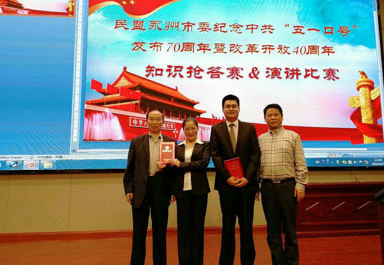本网讯 4月27日,民盟永州市委举行纪念中共“五一口号”发布70周年暨改革开放40周年系列活动之知识抢答赛和演讲比赛,我校民盟支部参加了比赛,永州市委常委统战部部长石艳萍、民盟永州市委主委袁火林到场观看。