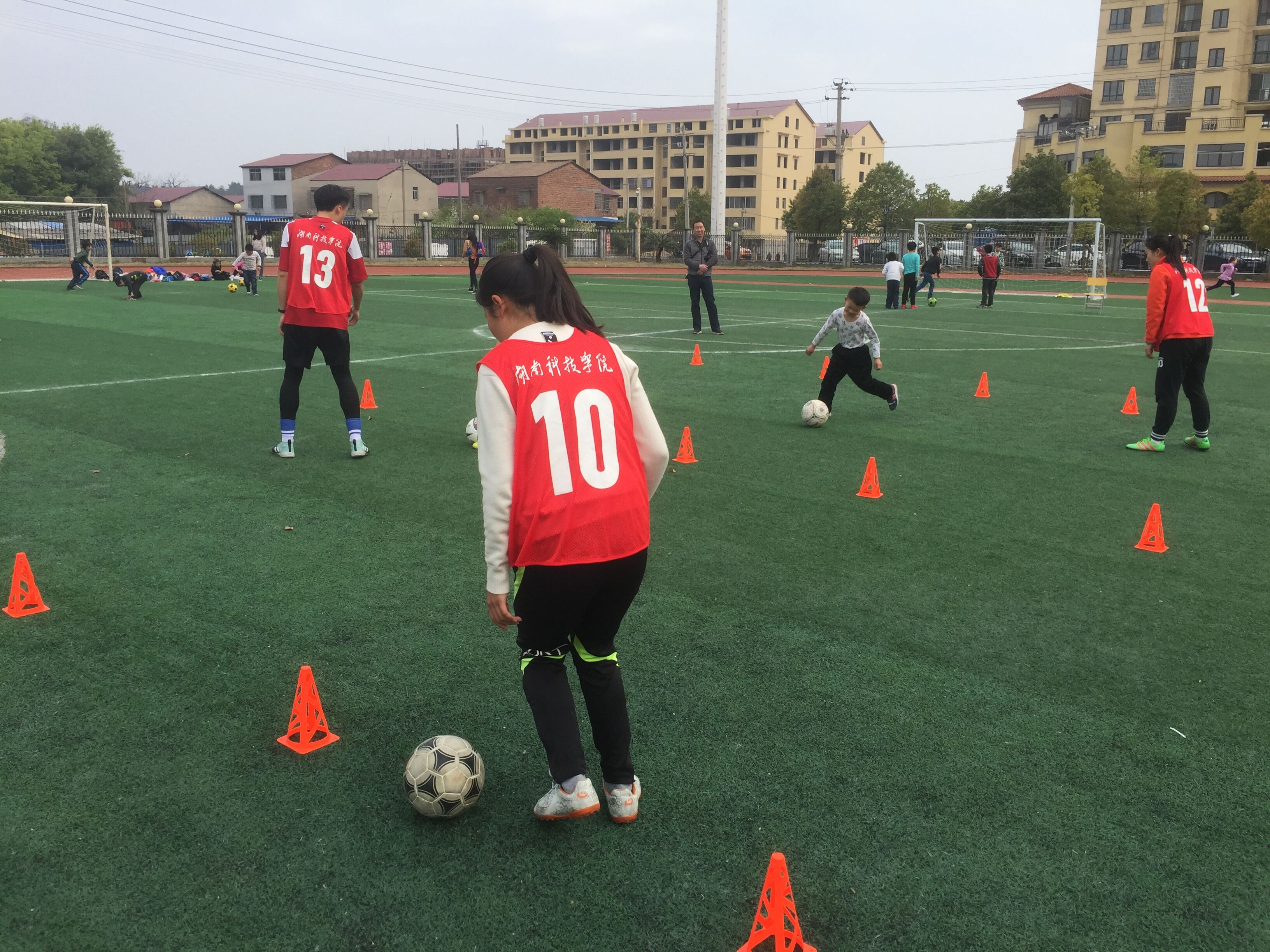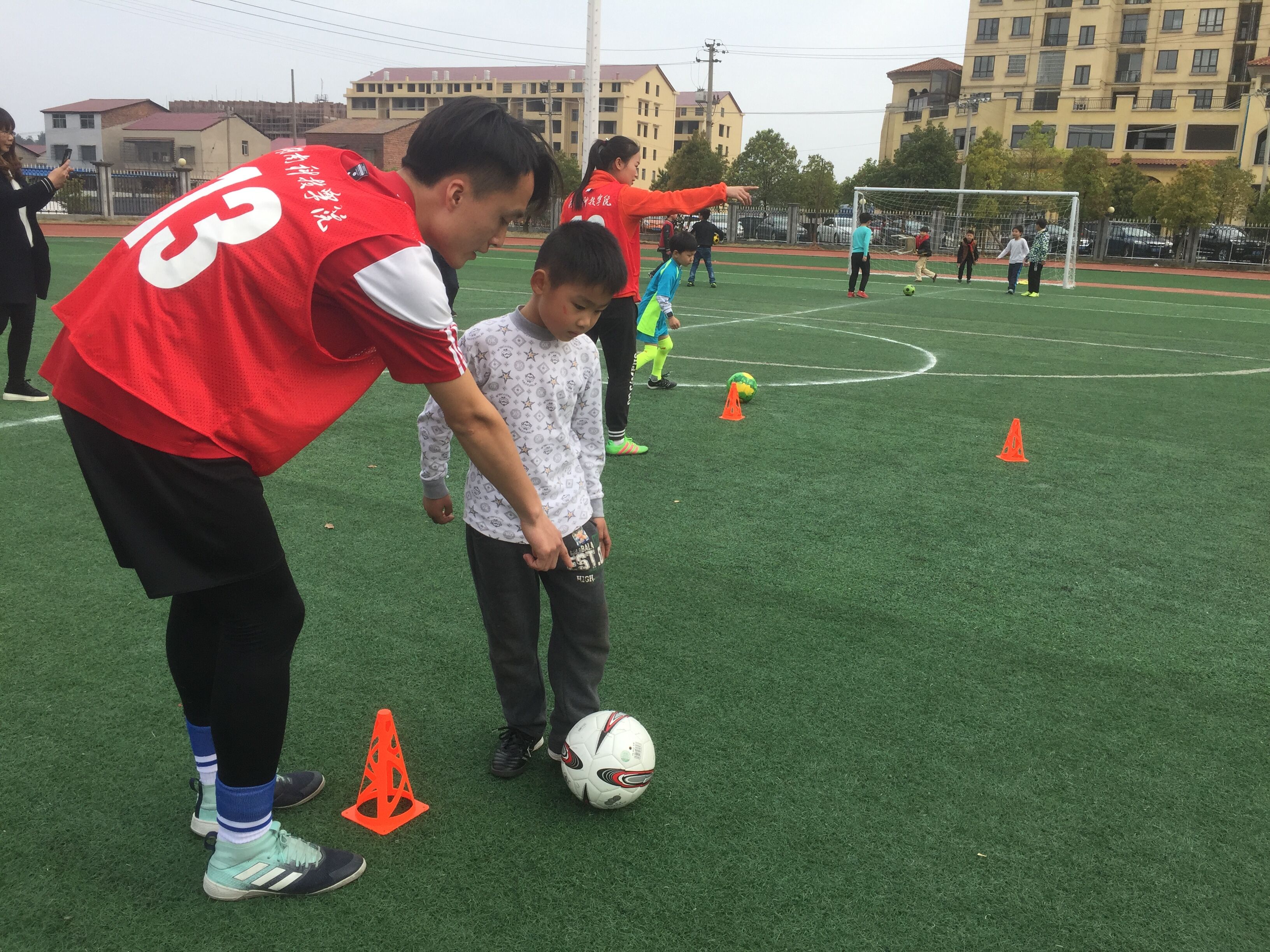 由我校体育学院足球专业班学生组成的教练队伍受到了职院附小师生及家长们的热烈欢迎。小教练们一到场地便马上投入到与小朋友的游戏互动中。他们讲授足球基本知识,带领小朋友们做足球游戏,做绕杆、射门练习等,气氛欢快热闹,许多家长纷纷也加入其中,和孩子们一起游戏,给他们加油鼓劲。家长们纷纷赞扬:“你们的支教活动不仅培养了孩子们的足球兴趣,更给他们带来了健康和快乐,非常感谢你们。”
