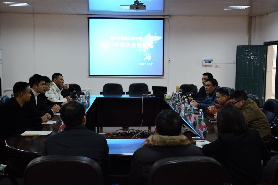 本网讯 12月2日下午,电子与信息工程学院在知行楼召开2017年电信院校企合作论坛。广州同晟国际货运代理有限公司、佛山市广兴洲照明有限公司、湖南谷维信息技术有限公司、弘成科技有限公司的HR以及该体院领导和师生代表参加了此次论坛。