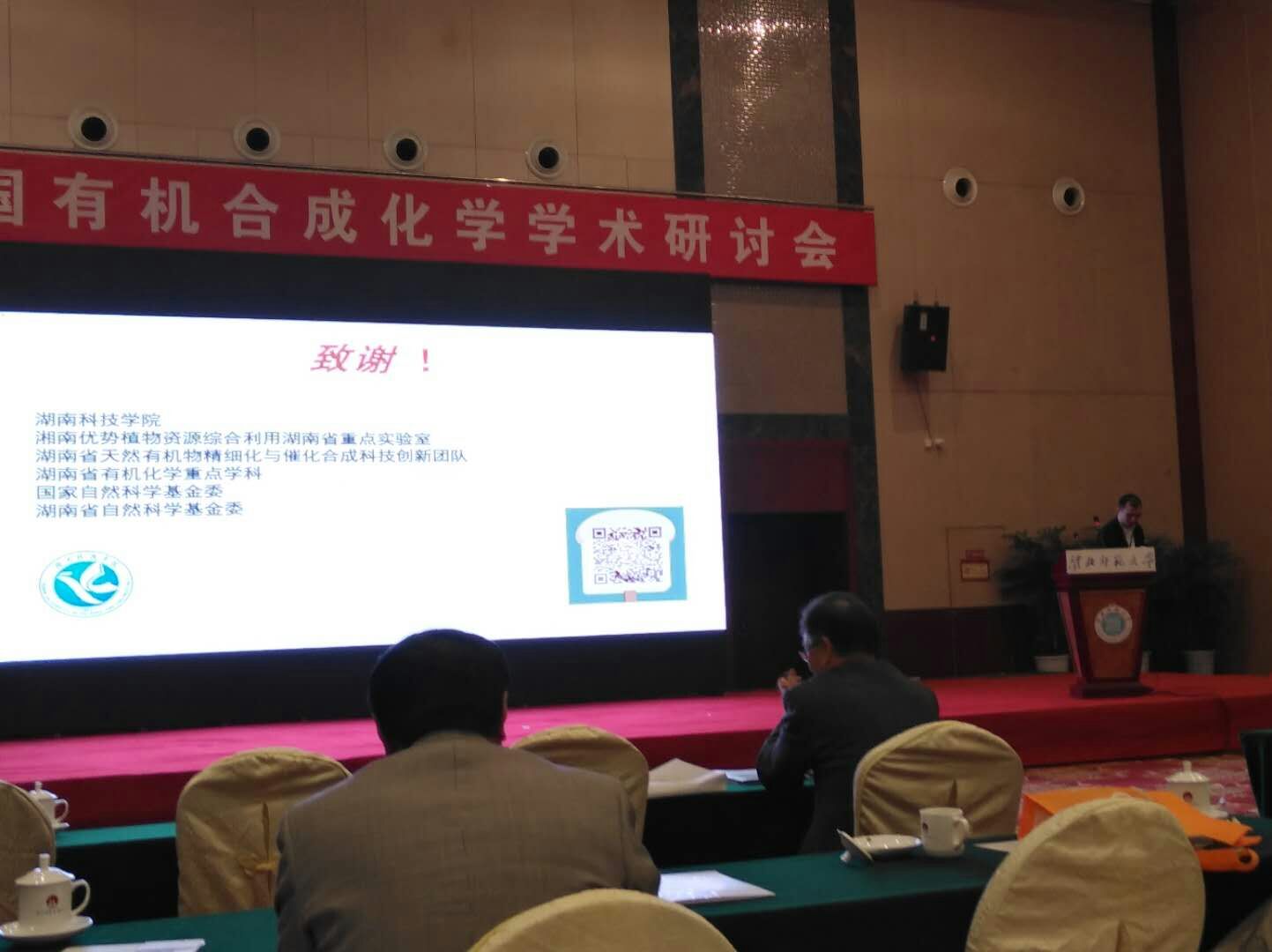 何卫民在报告中介绍了该课题组的主要工作,然后从水相炔烃绿色官能化反应、水相氮杂环化合物官能化反应等方面进行了工作阐述。报告结束后,何卫民与参会专家学者进行了深入交流与讨论,分享了最新研究成果,探讨绿色有机合成及其产业化研究新思路,为之后学校间的学术交流奠定了基础。此外,由我校教师左文设计、彭莎和王峥制作的学术墙报,不仅展示我校在绿色化学研究领域的成果,还将永州的风景名胜呈现给与会嘉宾,受到了与会专家的一致好评。