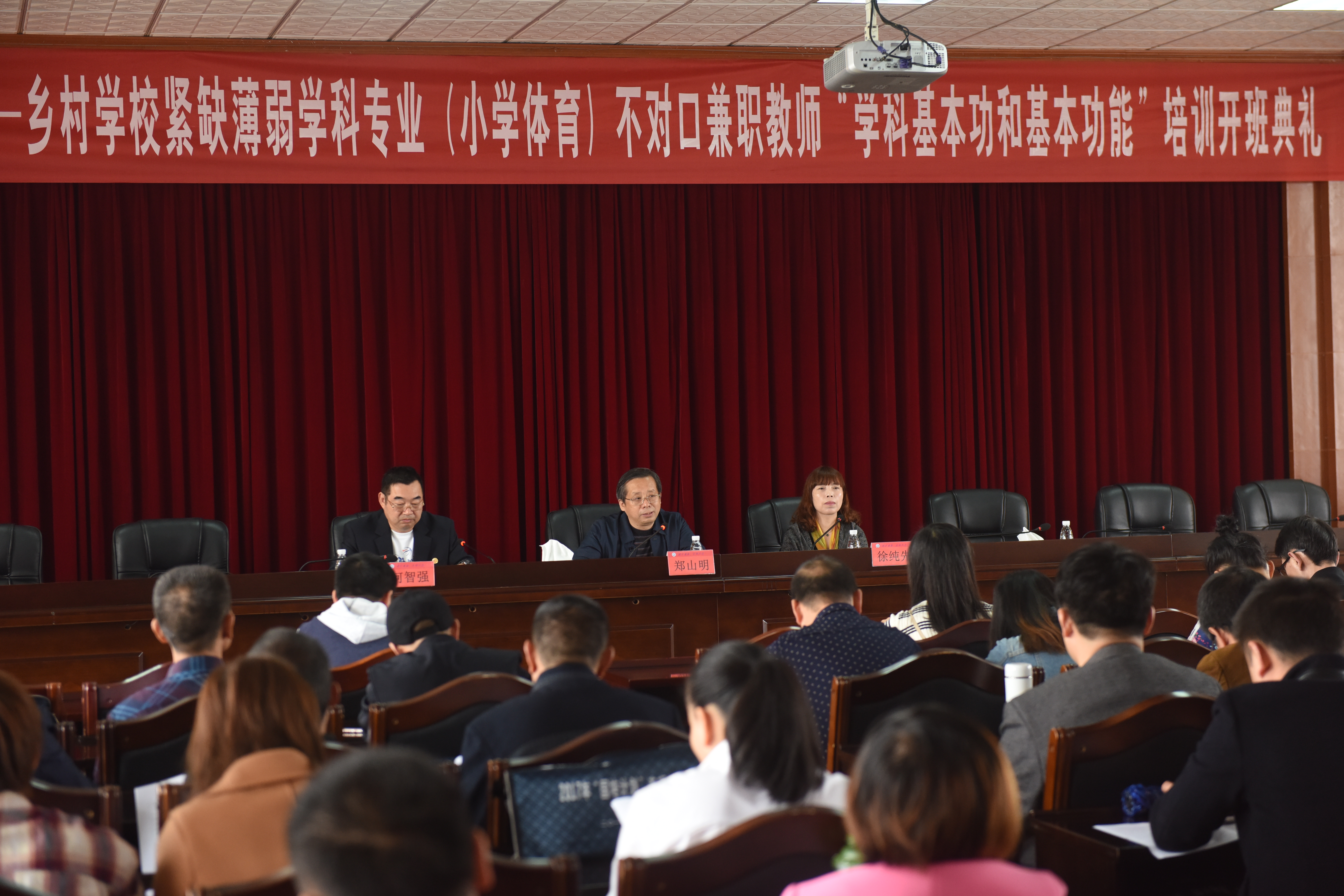 本网讯 11月10日,“国培计划(2017)”——乡村学校紧缺薄弱学科专业(小学体育)不对口兼职教师“学科基本功和基本功能”培训开班典礼在行政楼八楼一会议室举行,副校长郑山明、继续教育学院院长徐纯先出席本次开班典礼,体育学院党总支书记何智强主持开班典礼。