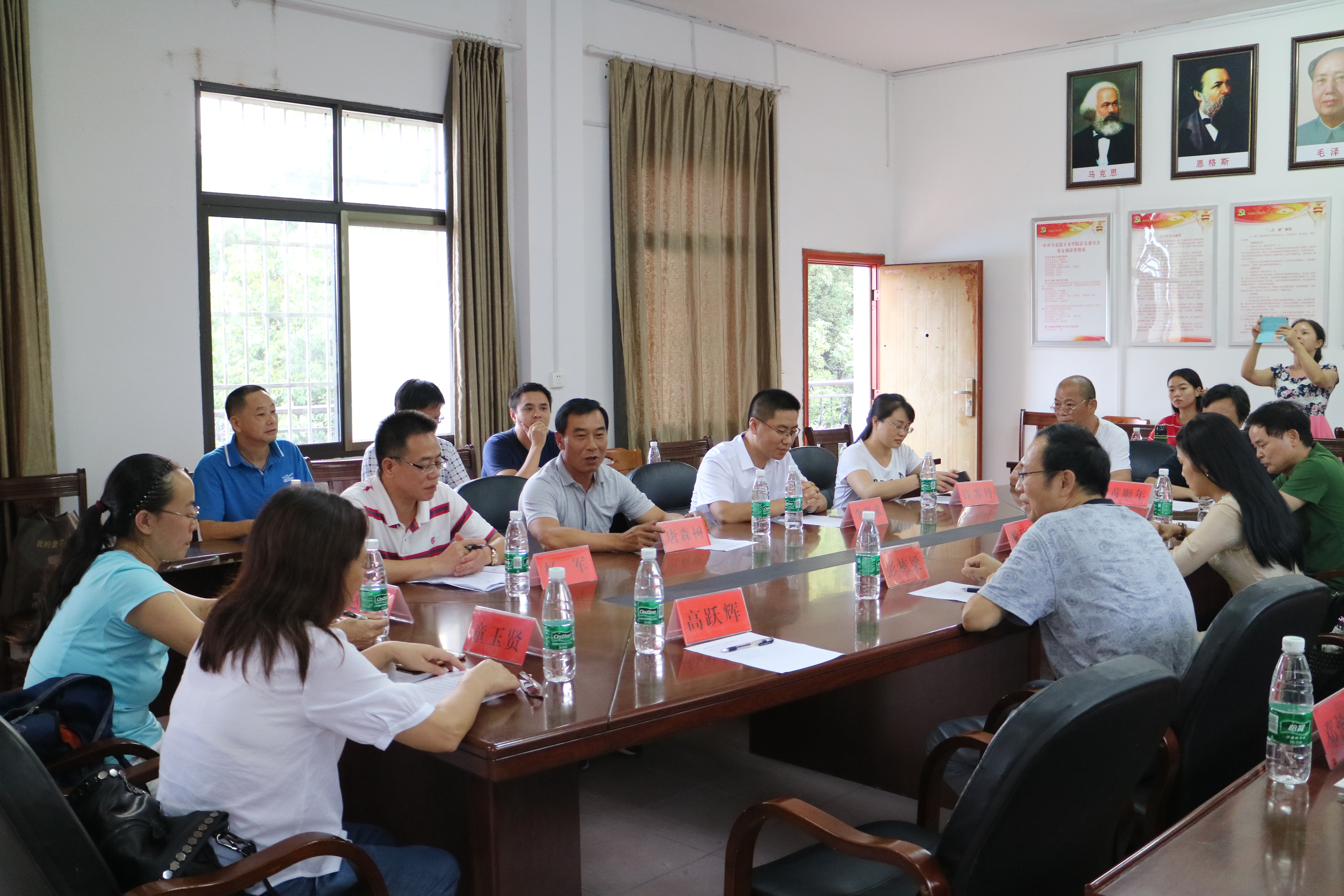 本网讯 9月22日下午,湖南工程学院思想政治理论课教学部彭栋梁主任一行来我校马克思主义学院考察交流。该院党总支书记唐森树、副院长杨军、副书记李观求及教学部主任参加交流座谈会。