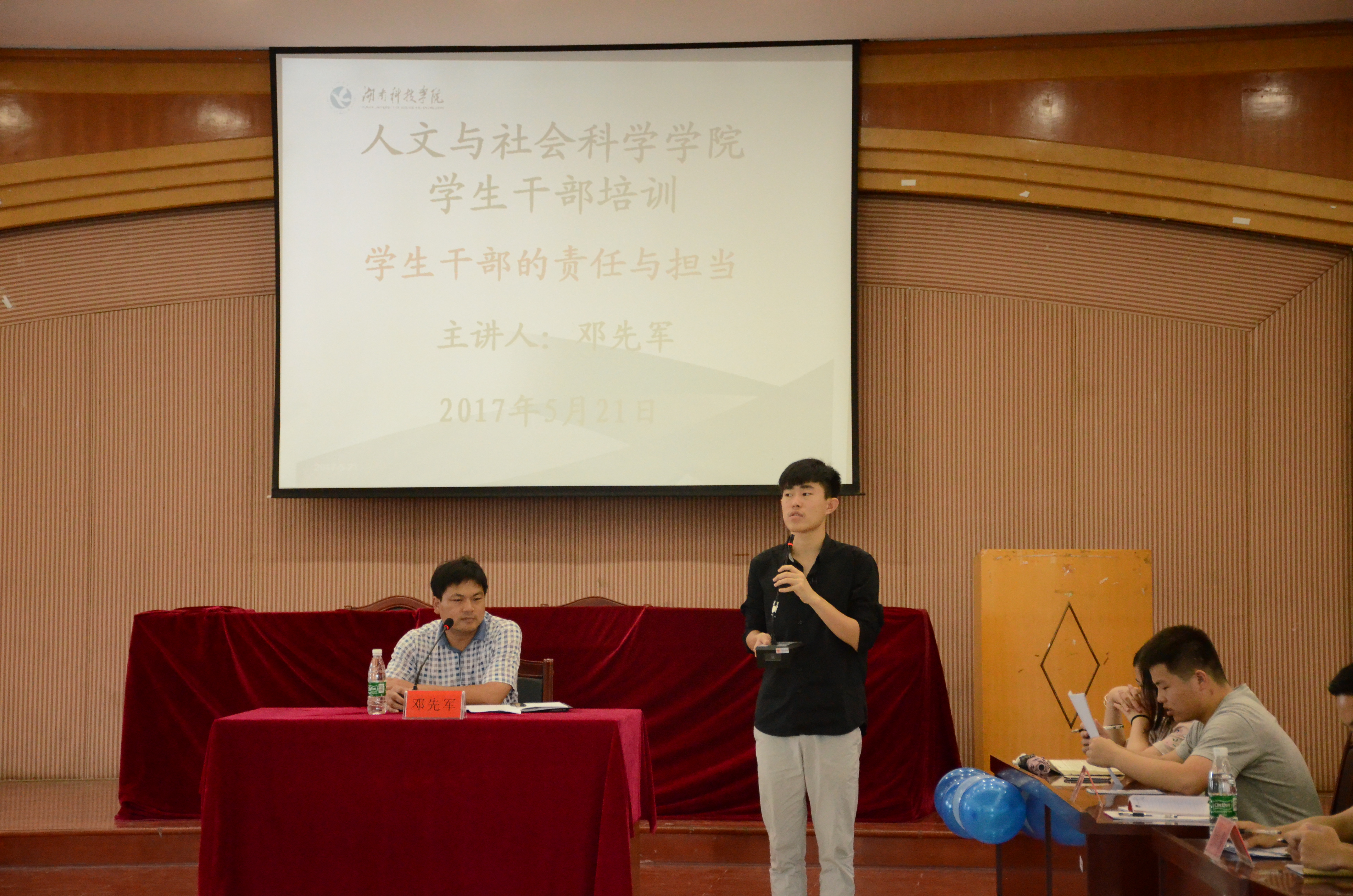 本网讯 5月21日下午,人文与社会科学学院举行学生干部培训会。培训会以“学生干部的责任与担当”为主题,该院党总支副书记邓先军主讲,该院分团委、学生会全体学生干部参加了培训会。