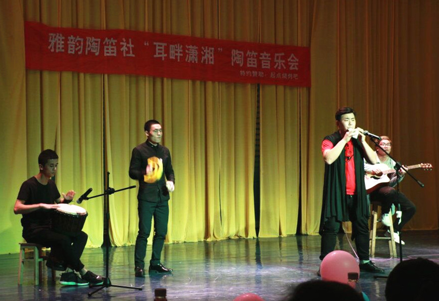 本网讯 一笛弹指,百种感受;一曲绕梁,千般韵味。4月21日晚由音乐与舞蹈学院雅韵陶笛协会主办的“耳畔潇湘”陶笛音乐会在我校小音乐厅举行,来自全校各学院的40余名陶笛爱好者齐聚一堂,共同为观众带来一场音乐盛宴。音乐与舞蹈学院院长邹林波出席。