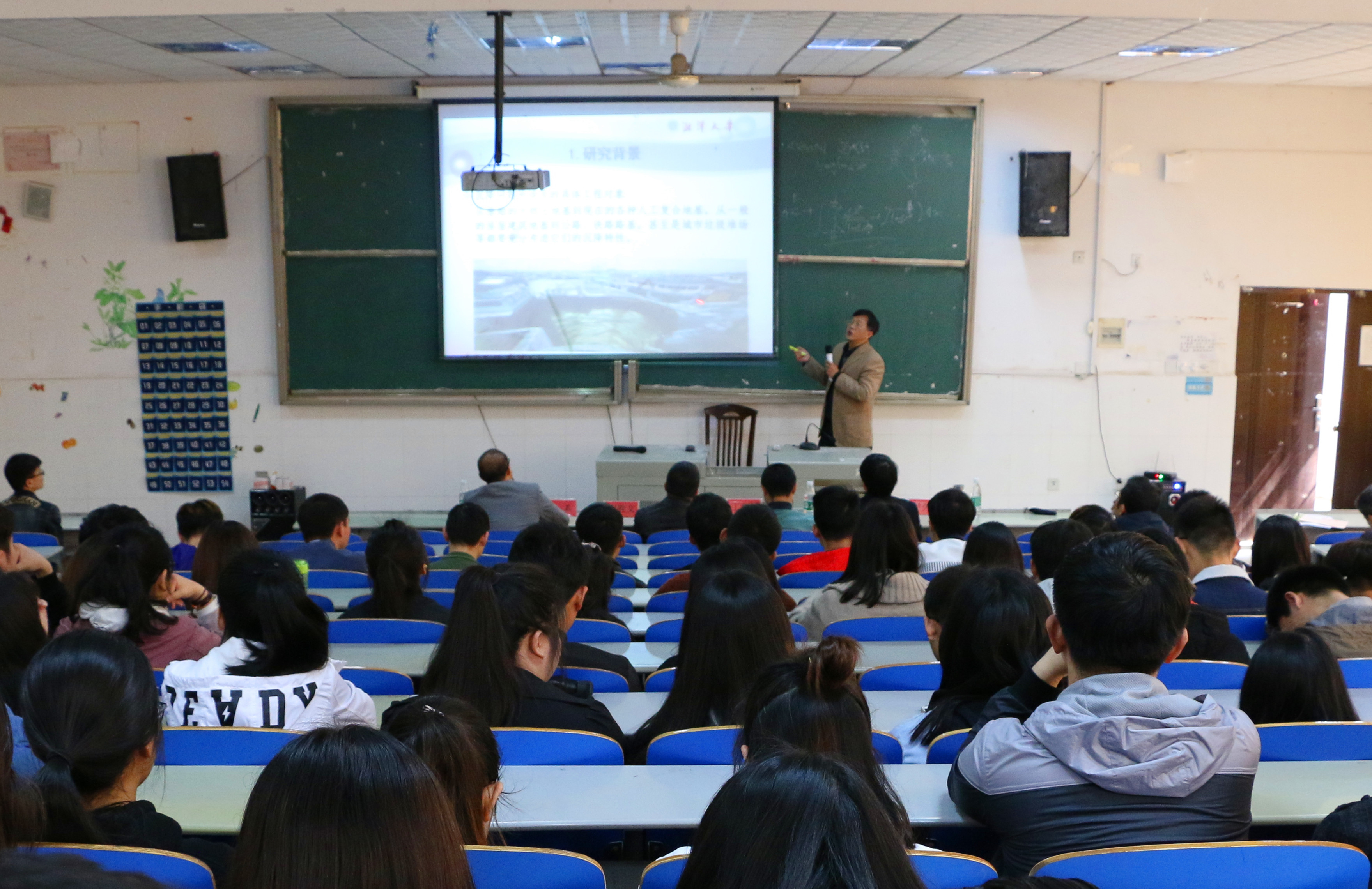 交流中,湘潭大学流变力学研究所副所长、硕士生导师尹久仁教授还在逸夫楼为该院的师生作了《倾斜层状横观各向同性弹性地基的半解析解》的学术报告。