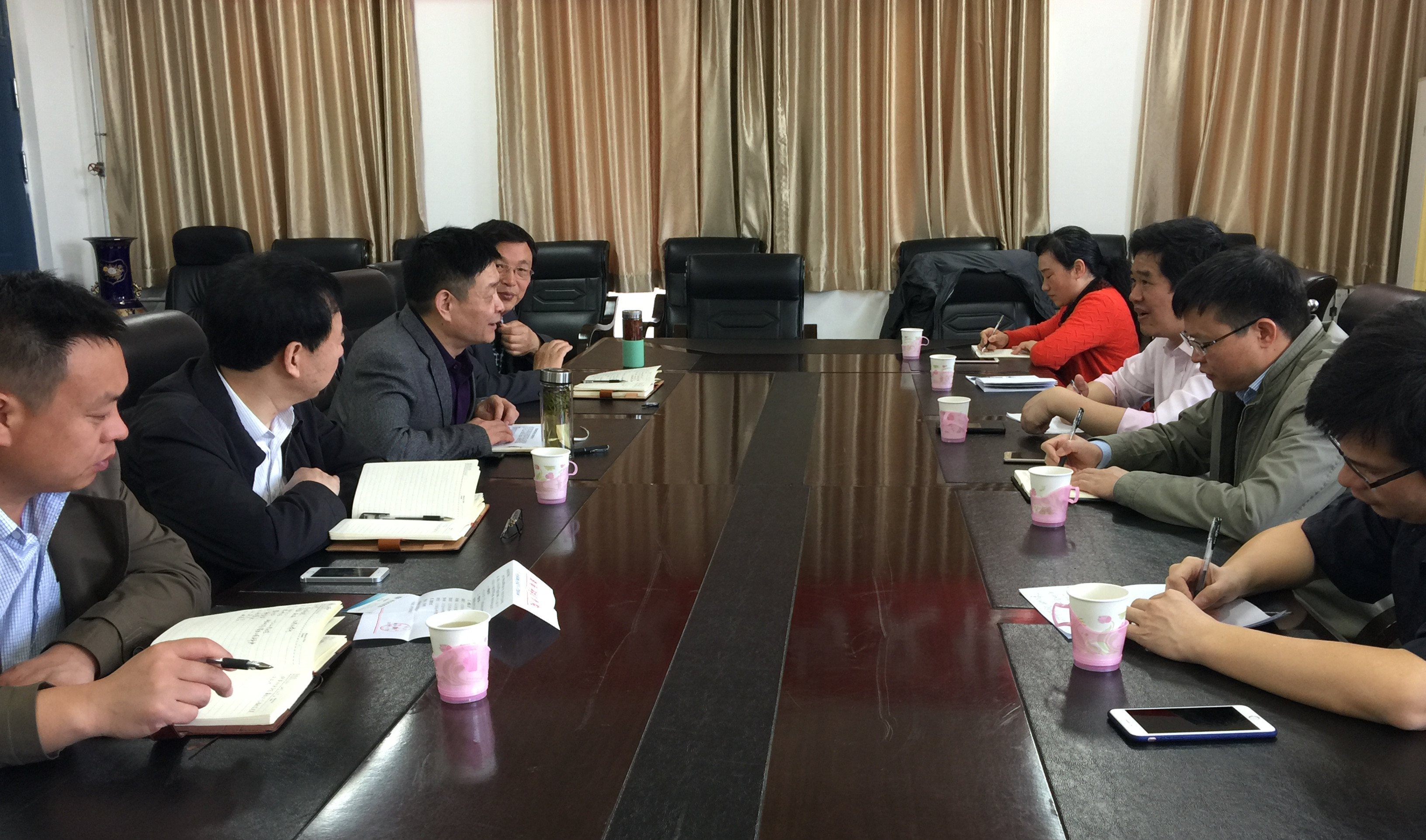 在许昌学院,潘雁飞与该校文学与传媒院院长刘道全教授进行了交流座谈。双方就课程设置、教学模式及学生实践实训能力的培养等方面进行了深入的交流,尤其是戏剧影视文学这一新办专业的建设,虚心求教,详细了解该院的教学经验。许昌学院的戏剧影视文学专业2008年开始招生,现已成为该校重点建设专业,教学成果丰硕,师生自编自演的话剧《当归》曾斩获 “金刺猬”大学生戏剧节金奖。