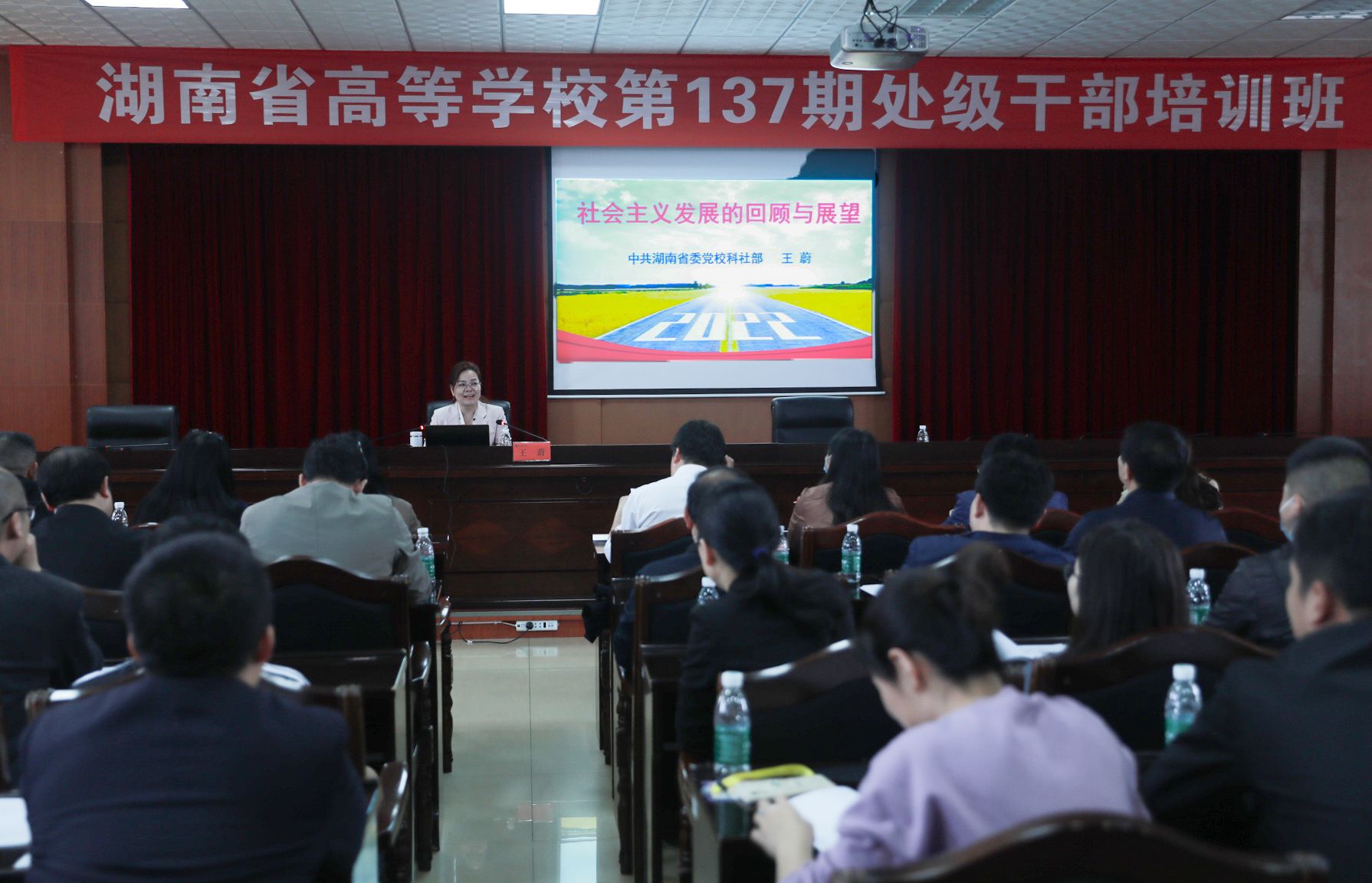 本网讯(记者 周秋珍 陈伟琳)5月20日,湖南省高等学校第137期处级干部培训班暨九游在线处级干部培训班第三、四课开讲。省政协常委、省政协学联委副主任孔和平,省委党校科学社会主义科研部副主任、教授王蔚来校授课。
