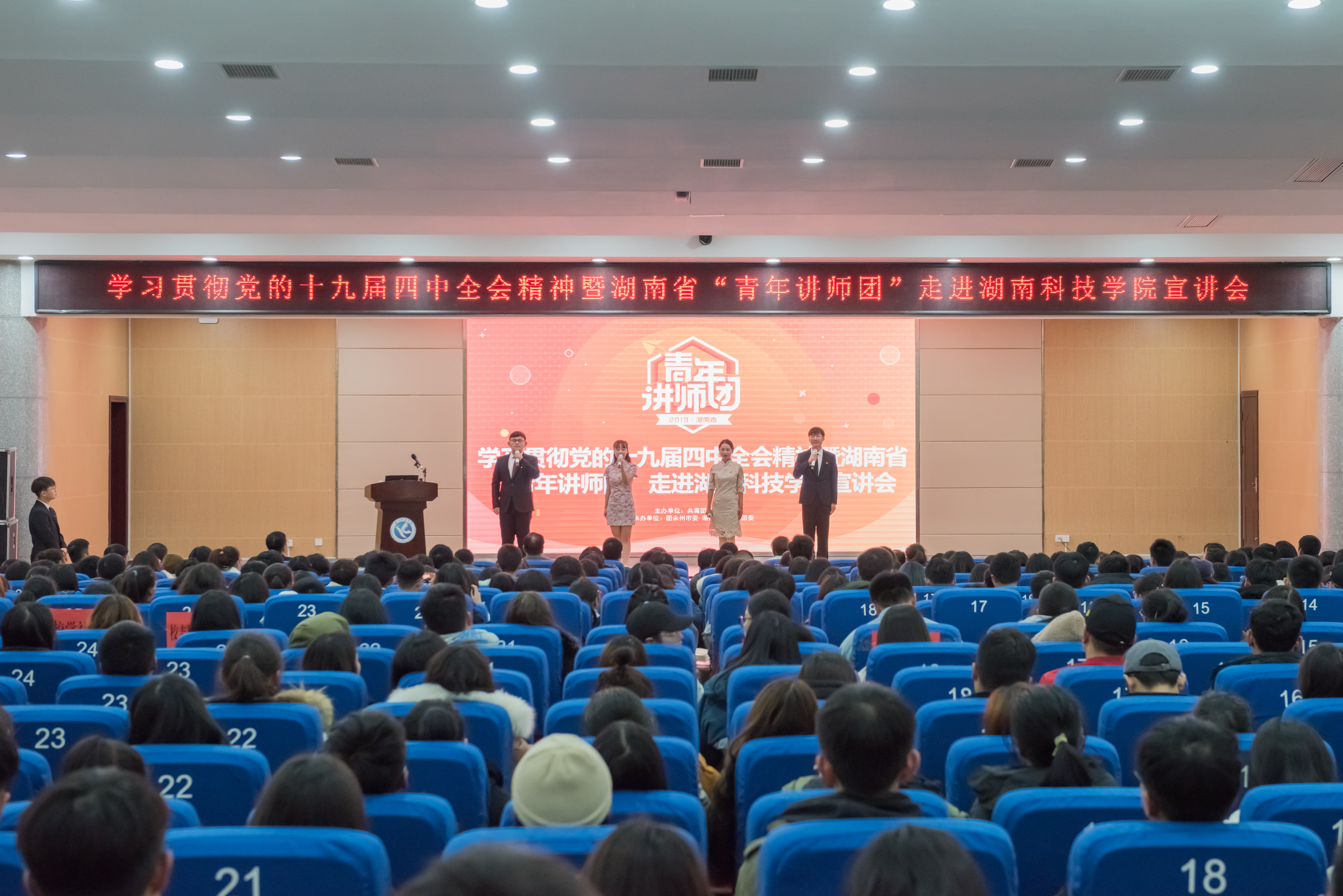 本网讯 12月19日晚,湖南省“青年讲师团”走进我校宣讲十九届四中全会精神。青年讲师们围绕学习贯彻党的十九届四中全会精神,结合自身工作实际,以自己的亲身经历和真情实感,生动讲述祖国发展成就故事和青年追梦奋斗故事,学校800余名师生代表现场聆听。