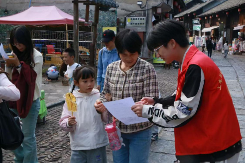 活动中,志愿者分组在古城入口、主次街巷等人流集中区域,通过张贴海报、现场讲解案例等形式,向游客与市民普及“步行守道、一盔一带”“斑马线文明礼让”等实用交通安全知识,特别针对“闯红灯”“分心行走”等常见隐患进行重点警示。