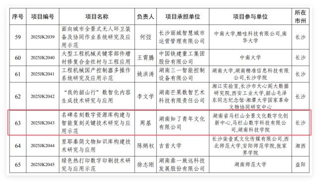 本网讯(通讯员 胡佳星 谢超)近日,湖南省科技厅发布了《关于2025年度湖南省重点研发计划项目立项的通知》,正式立项223项2025年度湖南省重点研发计划项目,由我校“砖石质文物智慧化保护利用技术湖南省重点实验室”主任周基教授作为负责人,湖南知了青年文化有限公司作为项目承担单位,湖南省马栏山全景文化数字化创新中心、马栏山数字科技有限公司、九游在线作为参与单位的科研项目“名碑名刻数字资源库构建与智能复刻关键技术研究与应用示范”成功入选。
