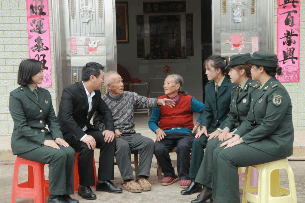 “爷爷您好,我叫陆燕,我是19年参军入伍的,在战略支援部队服役2年”、“我是杨新花,我叫莫寒,我们在陆军服役”、“爷爷好,原中国人民解放军火箭军96715部队上等兵田甜,向您敬礼”。在老兵家中,四名退伍大学生士兵围坐在他们身边,向他们汇报自己的参军入伍经历和现在部队里的变化。
