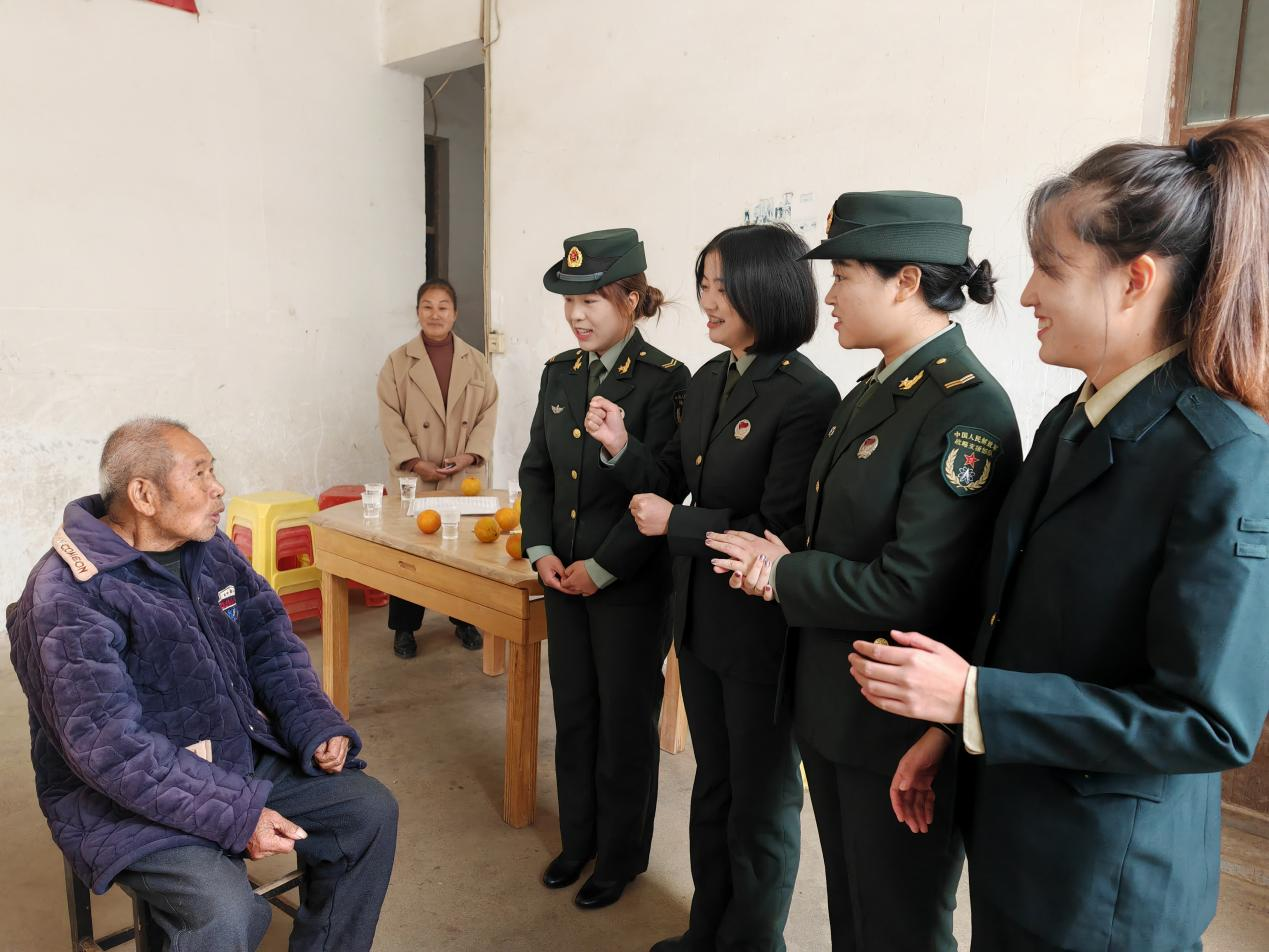 “爷爷您好,我叫陆燕,我是19年参军入伍的,在战略支援部队服役2年”、“我是杨新花,我叫莫寒,我们在陆军服役”、“爷爷好,原中国人民解放军火箭军96715部队上等兵田甜,向您敬礼”。在老兵家中,四名退伍大学生士兵围坐在他们身边,向他们汇报自己的参军入伍经历和现在部队里的变化。