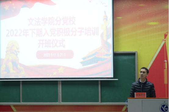 仪式开始,全体起立奏唱国歌。随后文法学院党总支副书记欧阳智超进行开班仪式致辞,对参加本次培训班学员表示欢迎,对同学们的发展和成长寄予深切厚望,并阐述了举办入党积极分子培训的意义。