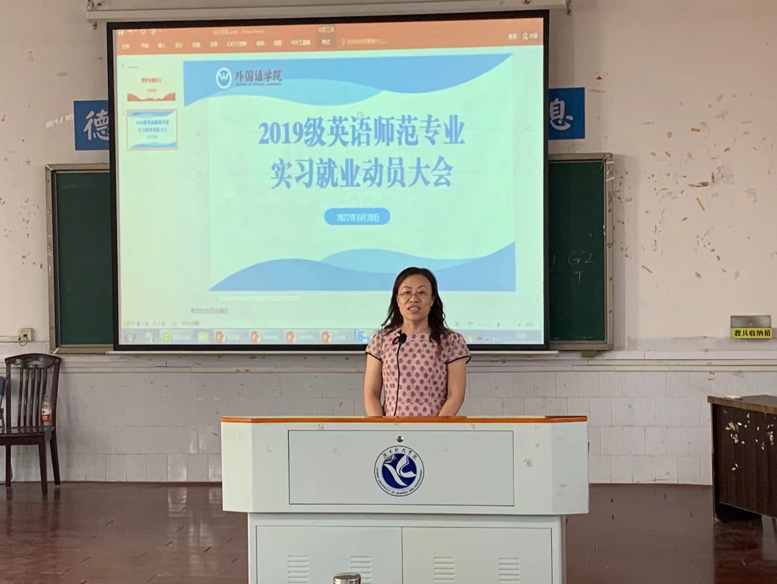 本网讯(通讯员 李政锴)9月16日下午,外国语学院在博雅楼东三召开2019级英语师范专业实习就业动员大会,外国语学院院长欧华恩,副院长彭宁红、刘堃,实习带队老师谭家善、陈碧园、郭旭明参加会议,会议由2019级辅导员李政锴主持。