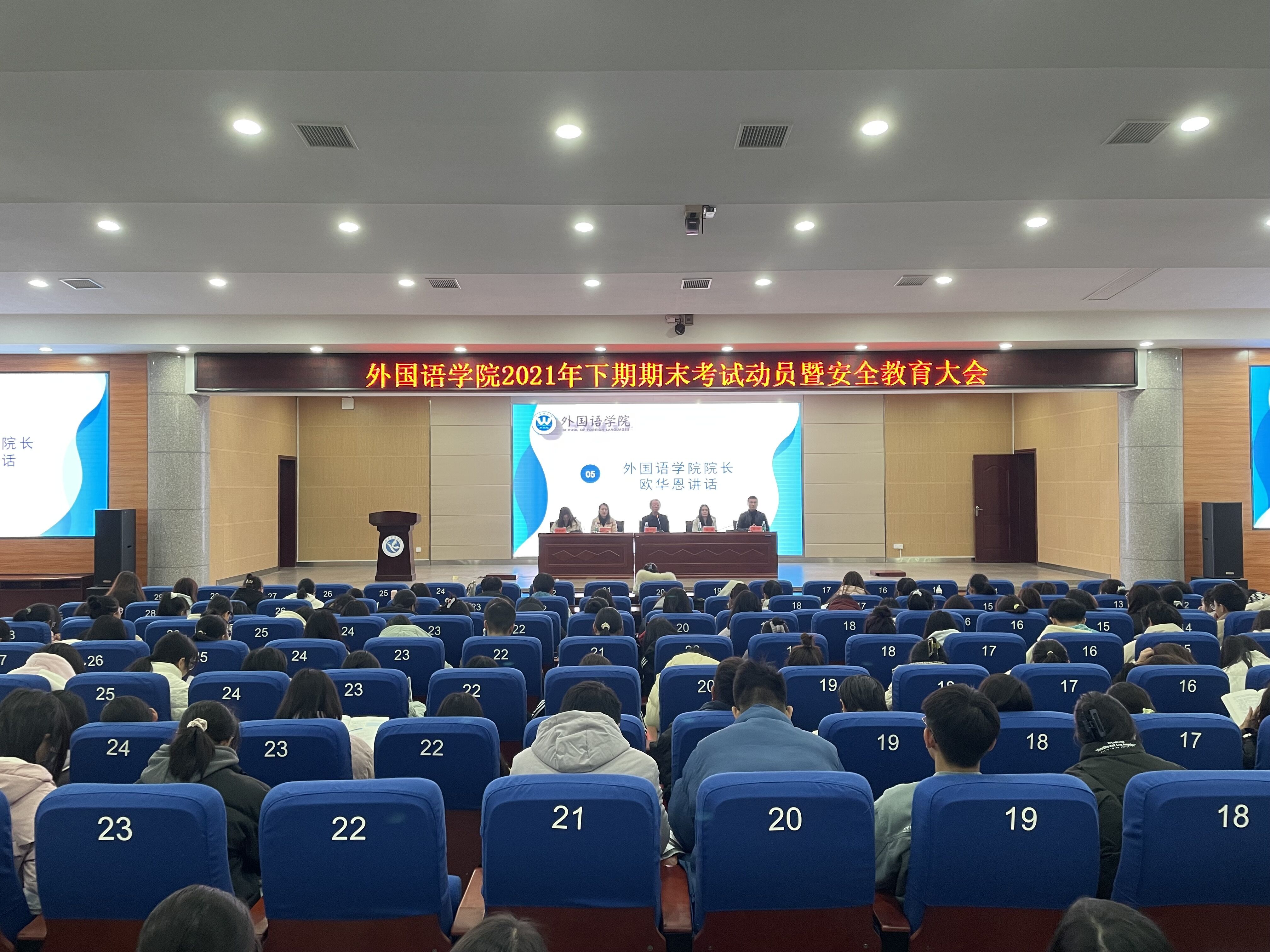 (通讯员 张坷馨)外国语学院于12月20日下午15:00在潇湘大讲堂召开期末考试动员暨安全教育大会。外国语学院院长欧华恩、党总支书记张剑、党总支副书记兼副院长罗晶,全体辅导员以及全体2020级、2021级学生参与此次大会。本次会议由学工办副主任、20级辅导员唐鹤轩主持。